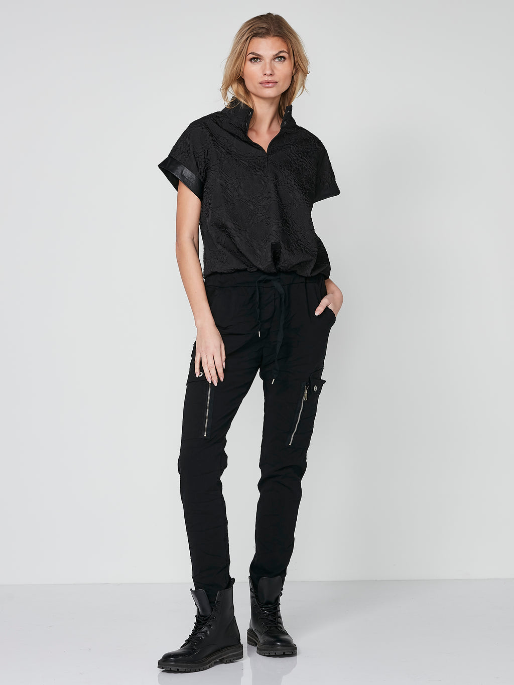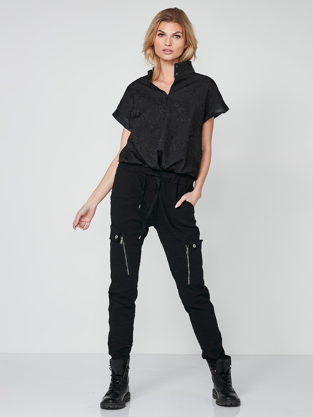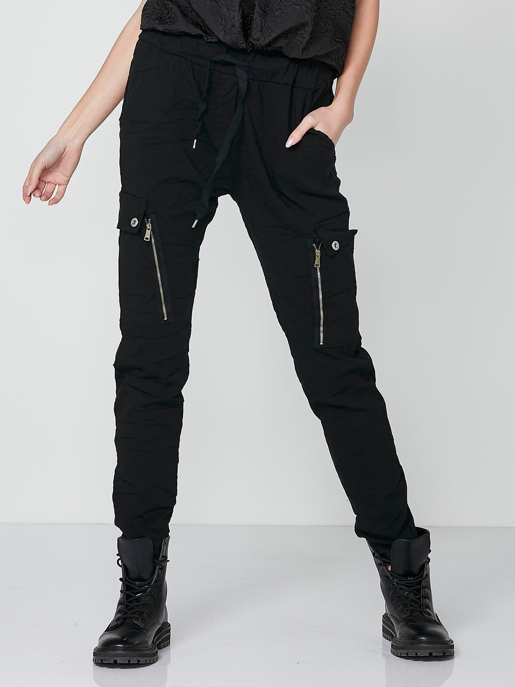 These cool trousers are in a delightful cotton quality with plenty of stretch. The trousers have a slight baggy fit and an elastic waist with a tie belt, ensuring fantastic comfort. In the middle of the trousers, there are two large buttoned pockets and a long decorative zip, adding a raw detail.