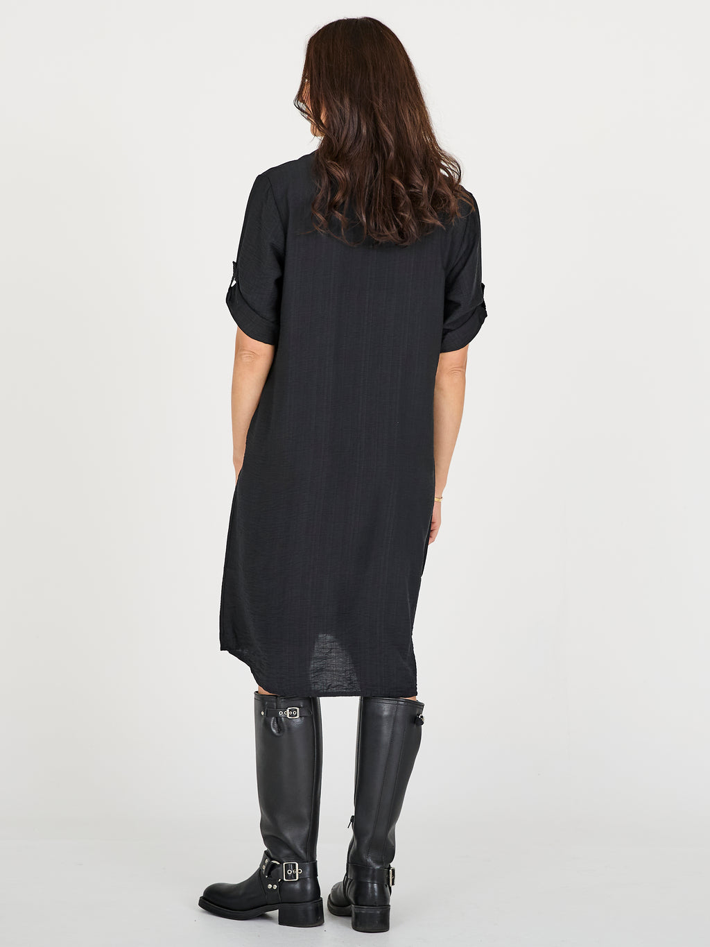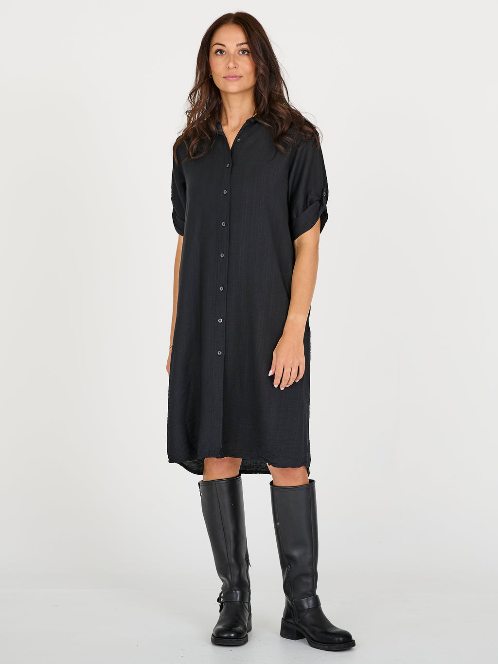 This shirt dress combines simplicity and functionality in a loose and comfortable cut. It features a full button closure at the front, a classic shirt collar, and cuffed sleeves that can be adjusted with button straps. The dress has side pockets, adding a practical element, and the lightly structured quality completes the relaxed look.
