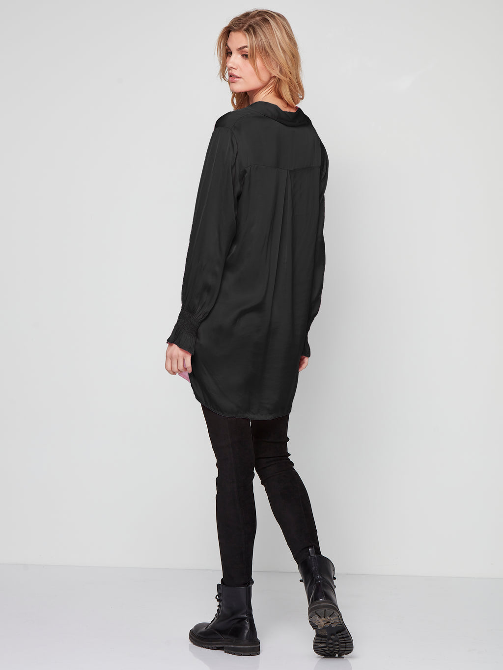 This tunic is the perfect combination of comfort and style. Made from a lustrous viscose, it is a luxurious style for any outfit. Designed in a loose-fitting silhouette, the tunic features a feminine V-neckline with a classic shirt collar and long sleeves with a delicate smock detail. Add a touch of glamour to your outfit with this tunic - wear it with a pair of your everyday trousers or leggings.