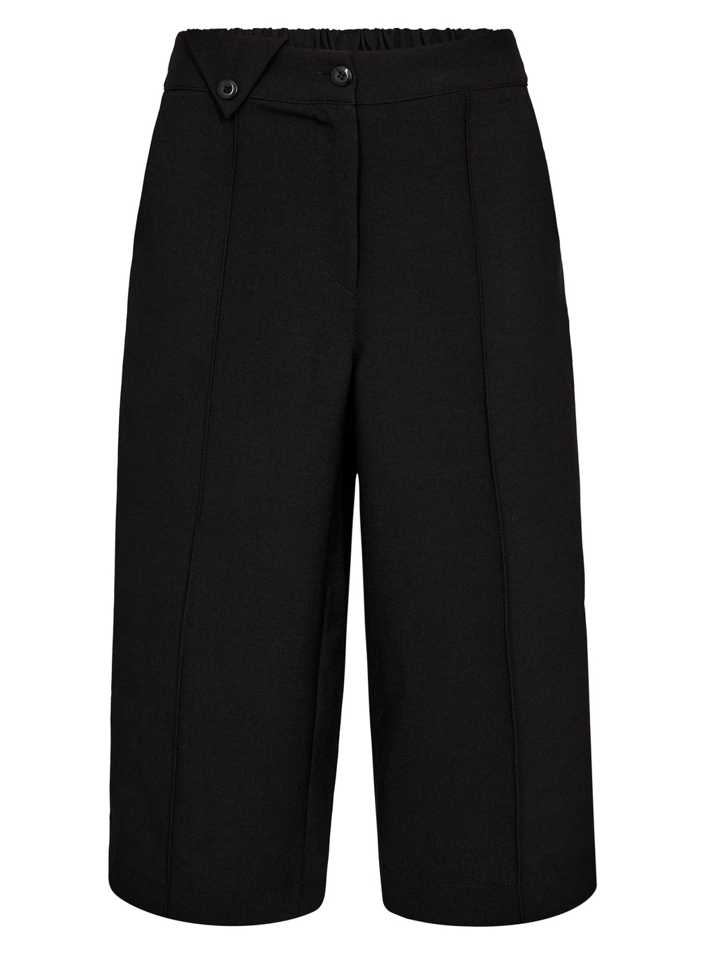 These shorts have a loose fit and a length that hits mid-calf, creating a modern and airy look. They feature front pleats, slant pockets, and an asymmetric button closure at the waist. The elastic waistband in the back ensures comfort and freedom of movement.