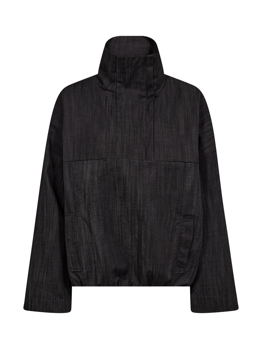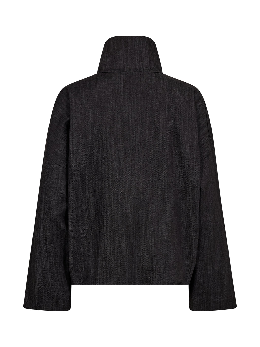 This top combines a structured material with a simple yet refined design. It features a high collar with a short zipper, wide sleeves, and a light boxy cut, which creates a relaxed yet well-dressed silhouette. The back follows the same simple expression as the front, making it easy to style across seasons.