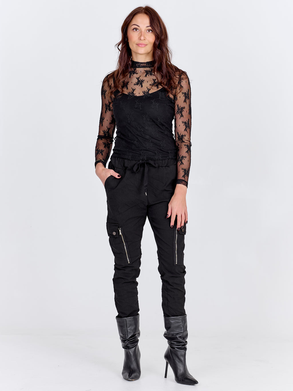 A feminine lace blouse in mesh with decorative floral embroidery all over. The tight fit and the small collar give an elegant look, while the long sleeves emphasize the light and sophisticated appearance. The blouse is the same at the front and back and can be styled layered with a knit over it, or alone with a basic top underneath.