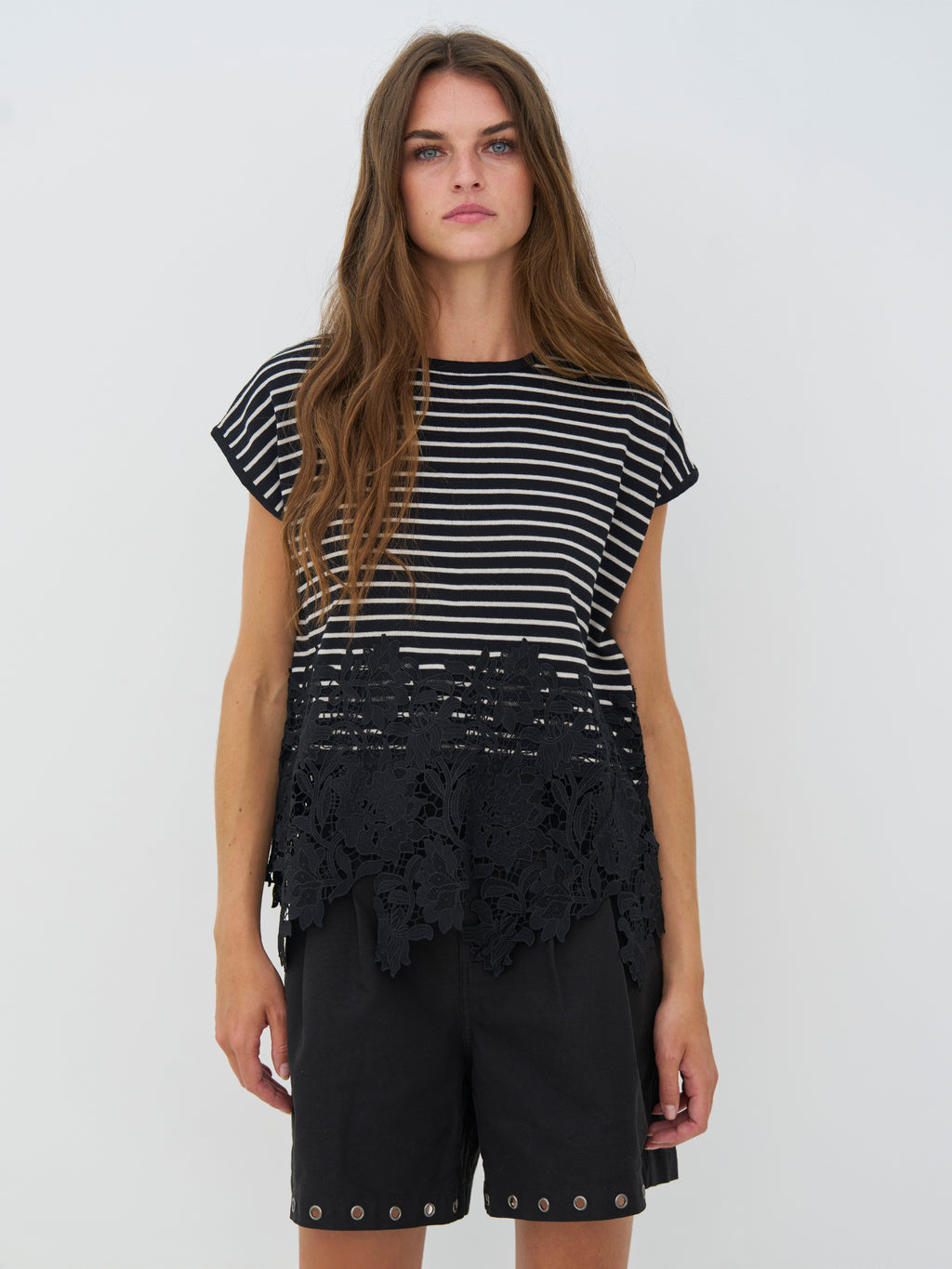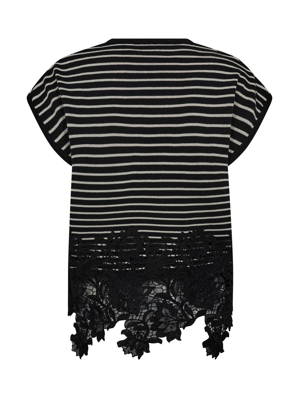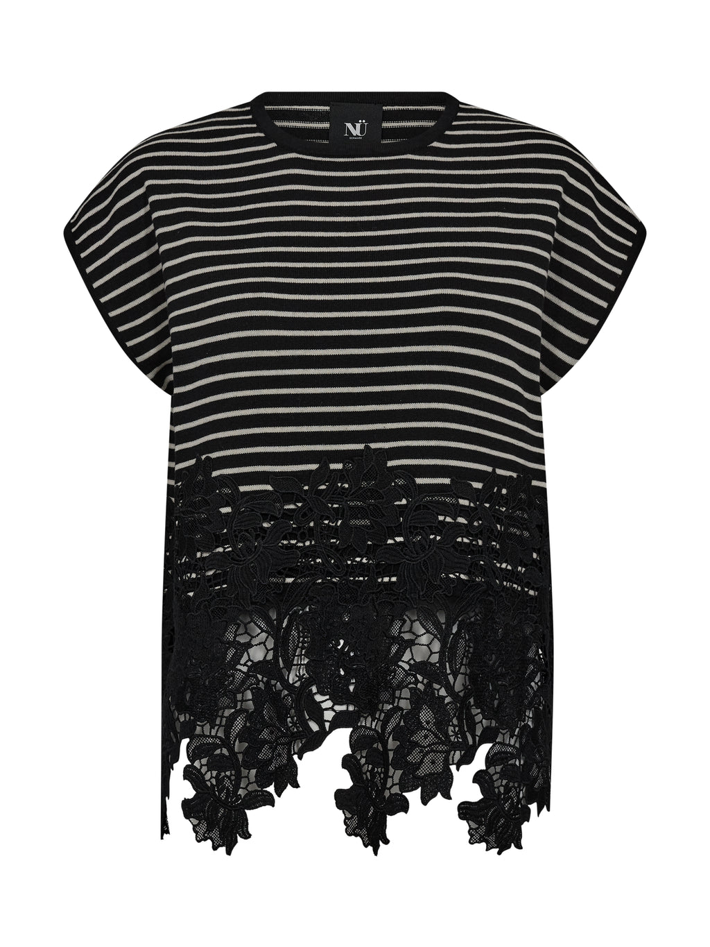 This knitted T-shirt combines a relaxed fit with fine details. The classic stripes create a calm expression, while the decorative lace edge at the bottom adds contrast and a bit of edge. The fit is straight with short sleeves, making it easy to style with both pants and skirts. A good balance between simplicity and a more feminine look - perfect for both everyday wear and more styled looks.