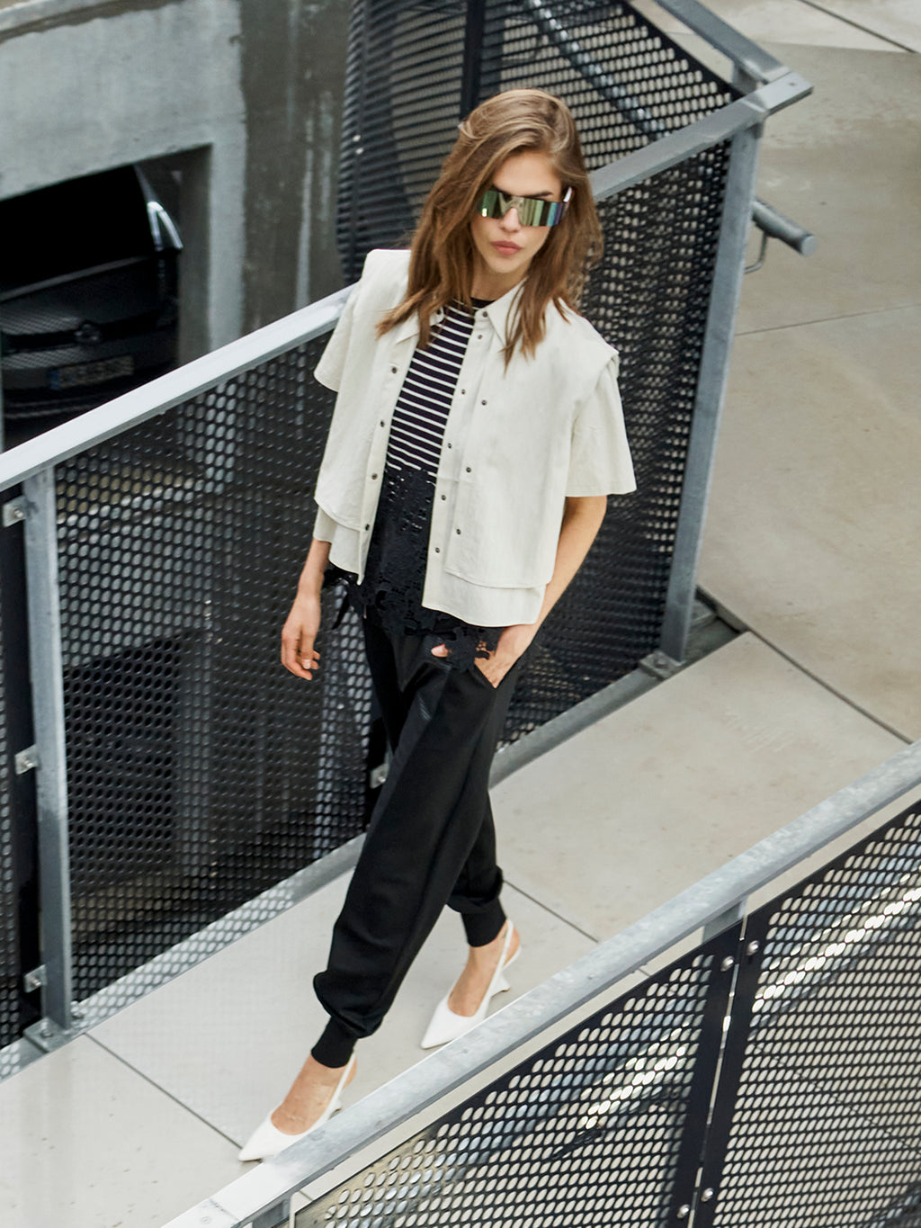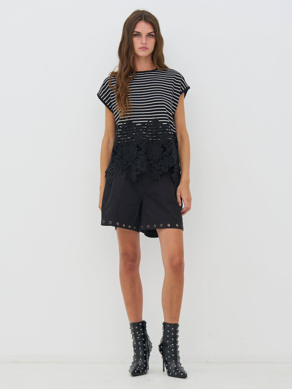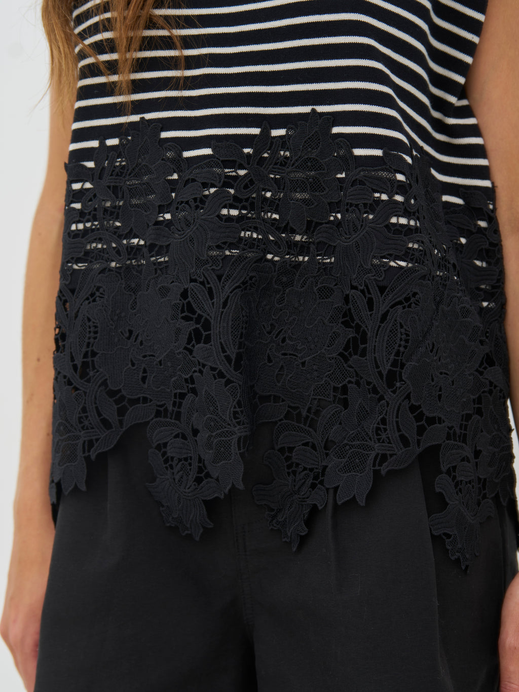 This knitted T-shirt combines a relaxed fit with fine details. The classic stripes create a calm expression, while the decorative lace edge at the bottom adds contrast and a bit of edge. The fit is straight with short sleeves, making it easy to style with both pants and skirts. A good balance between simplicity and a more feminine look - perfect for both everyday wear and more styled looks.