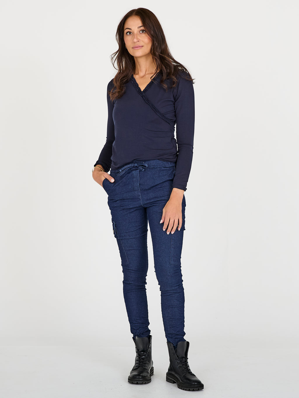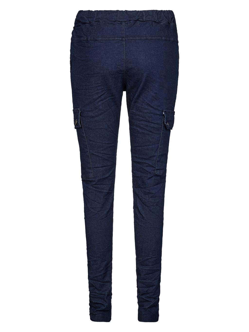 Add both comfort and character to the wardrobe with these denim-look trousers. The soft material with stretch ensures good freedom of movement, while the creased look and cargo-inspired details provide a relaxed and modern expression. The trousers have a slim fit, elastic waistband with a drawstring, and practical flap pockets on the legs. Style them with an oversized shirt and flat shoes for an effortless and stylish outfit. (As the trousers run small in size, it is recommended to size down.) (- Stretchy material. - Creased denim look. - Flap pockets on the legs.)