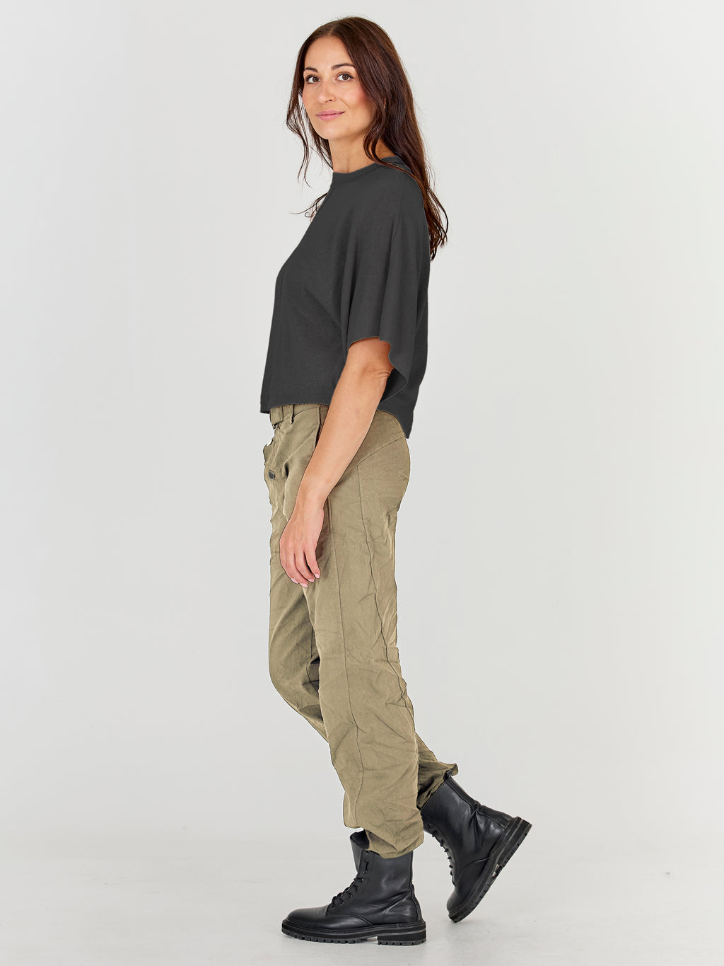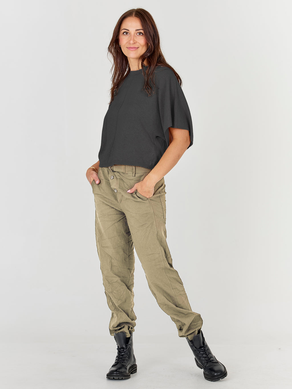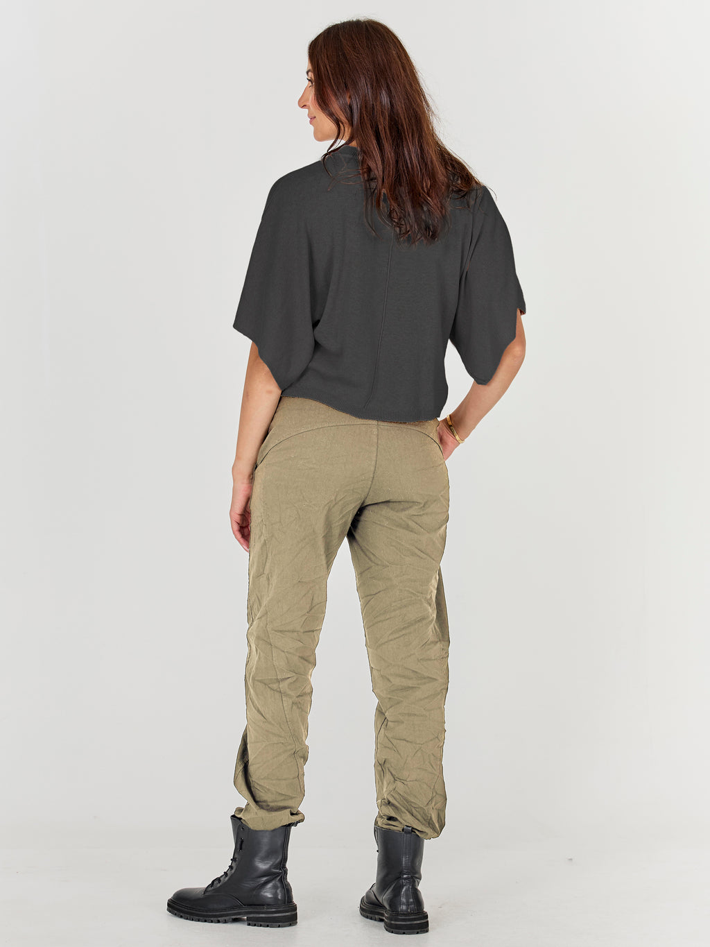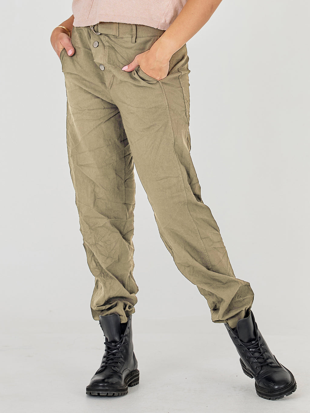 These pants are designed with a slim leg and a distinctive waistband, giving a simple and timeless look. At the front, they have a diagonal button closure and a belt with a metal ring, adding a clean and stylish detail play. At the back, the cut is clean with belt loops and markings that emphasize the fit. Style them with a lightweight knit or a shirt for a relaxed yet polished everyday look.