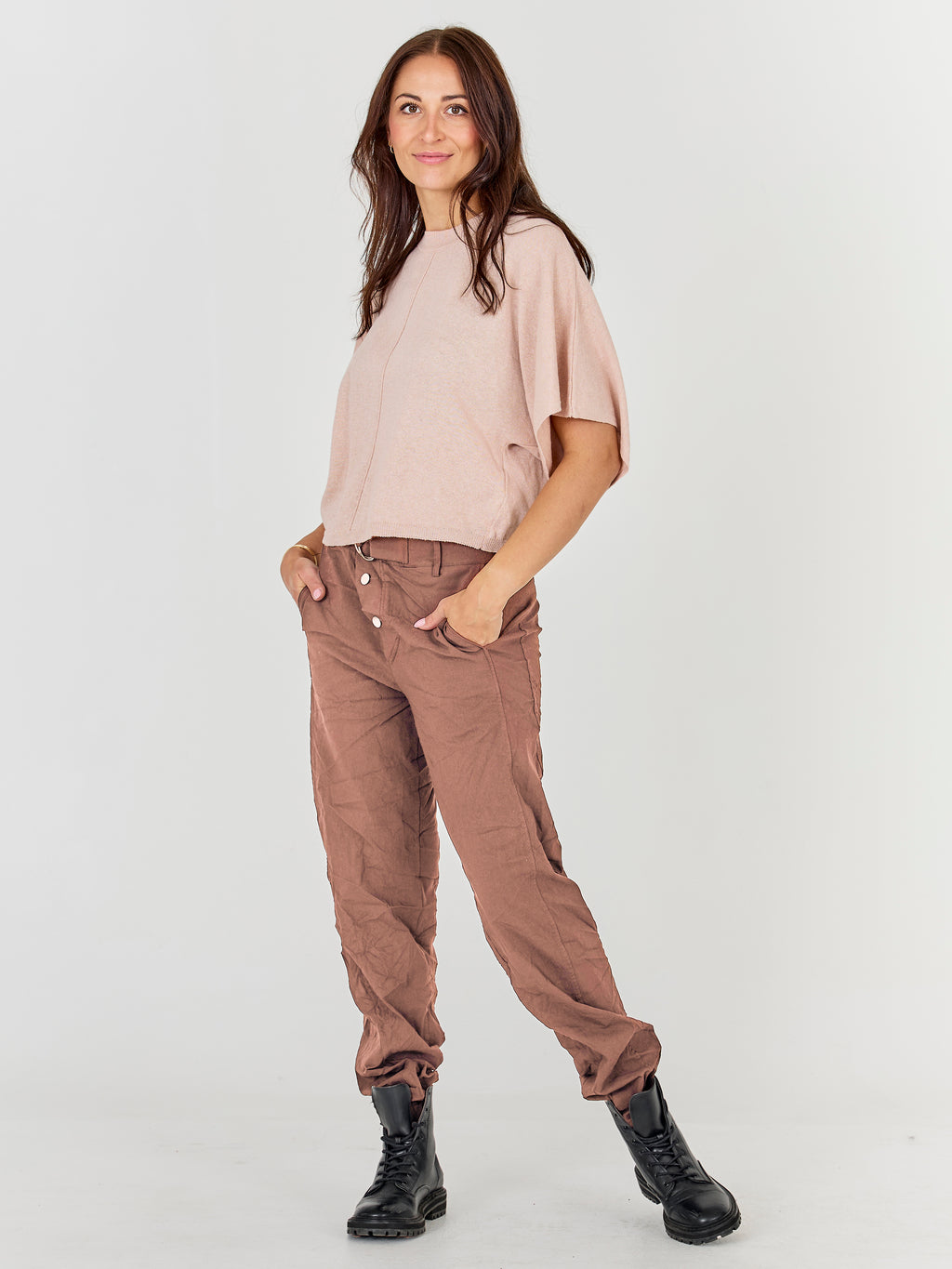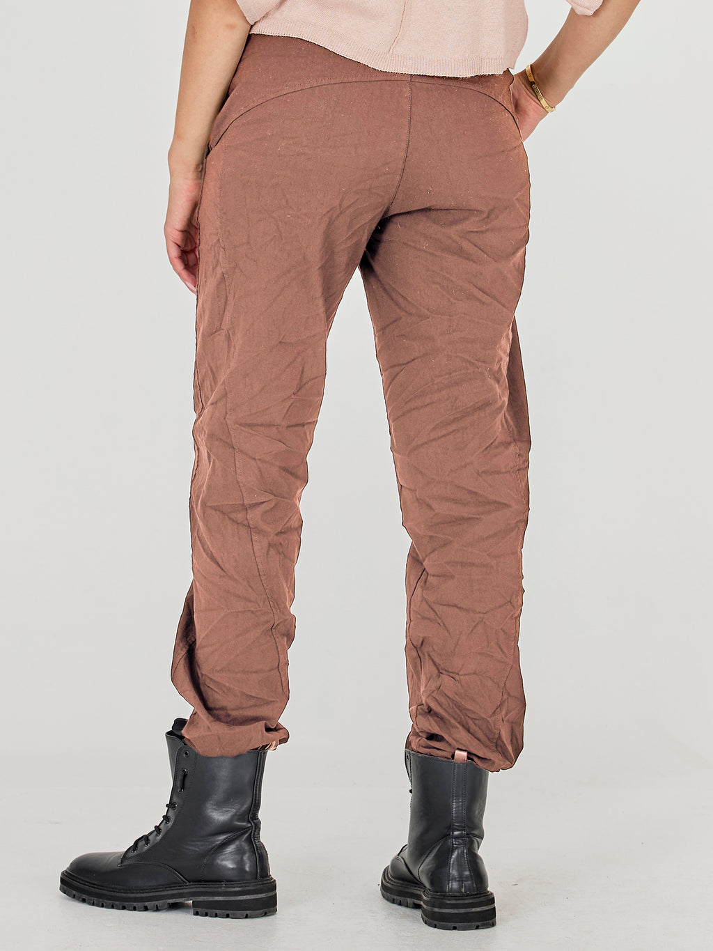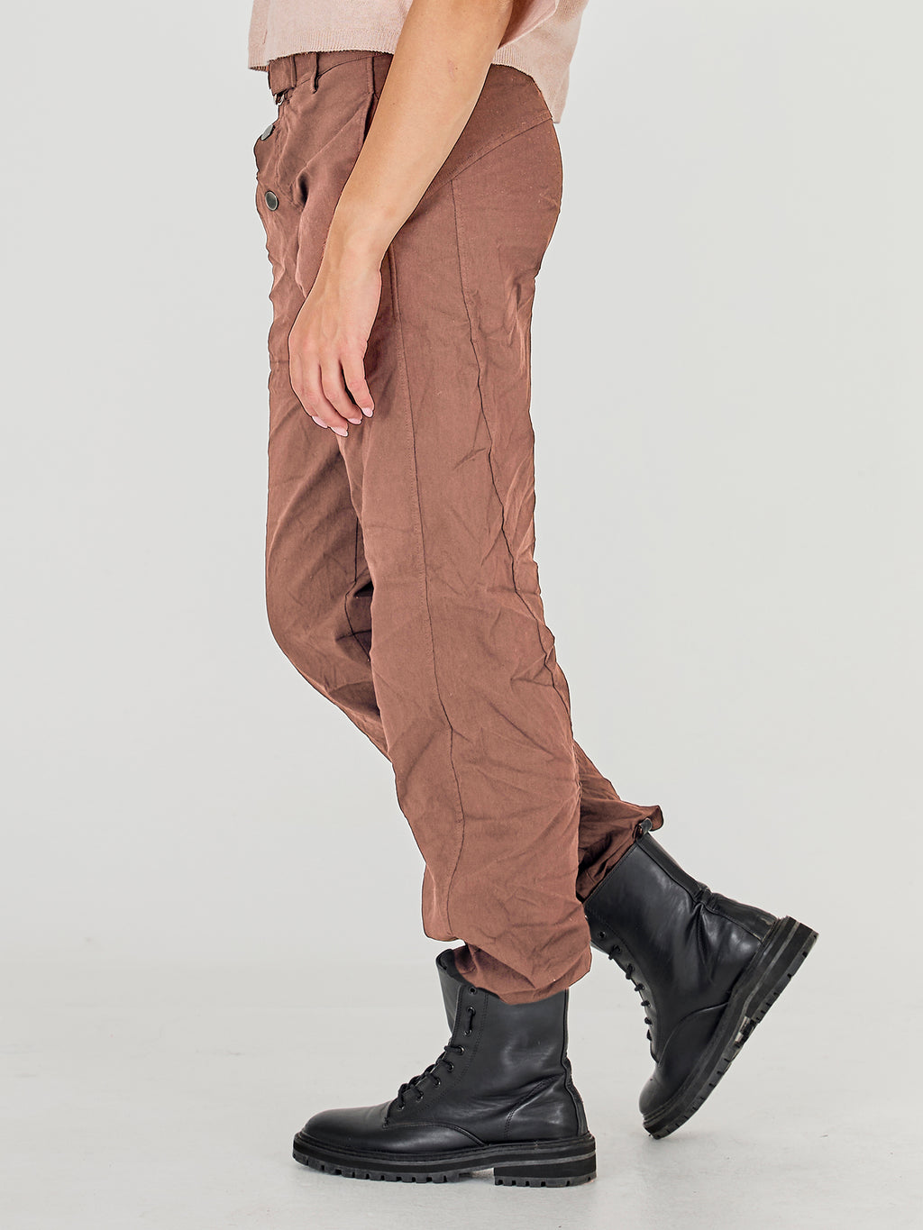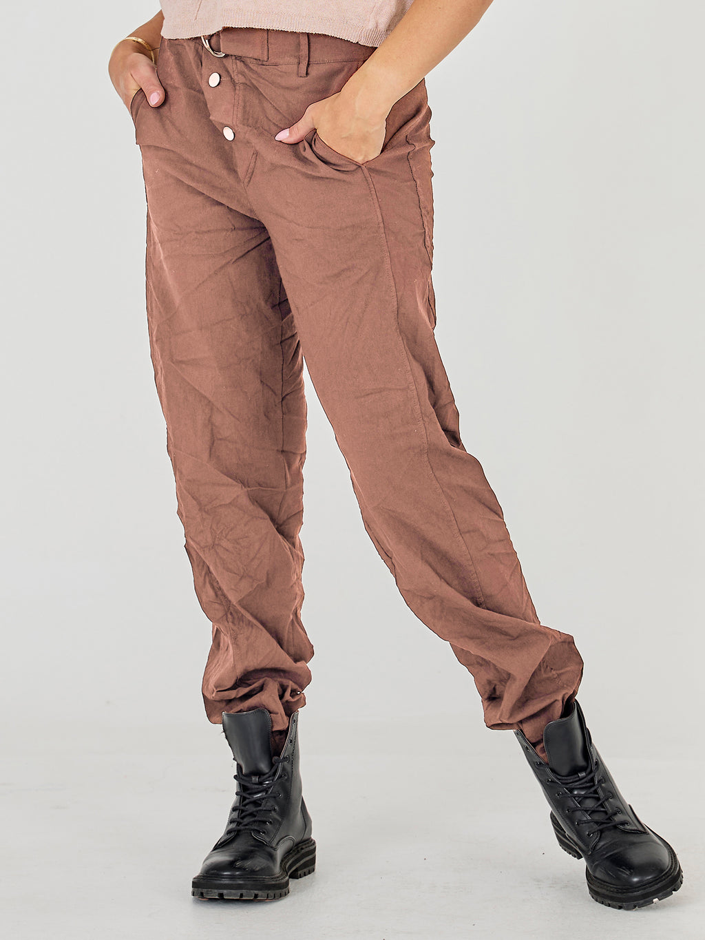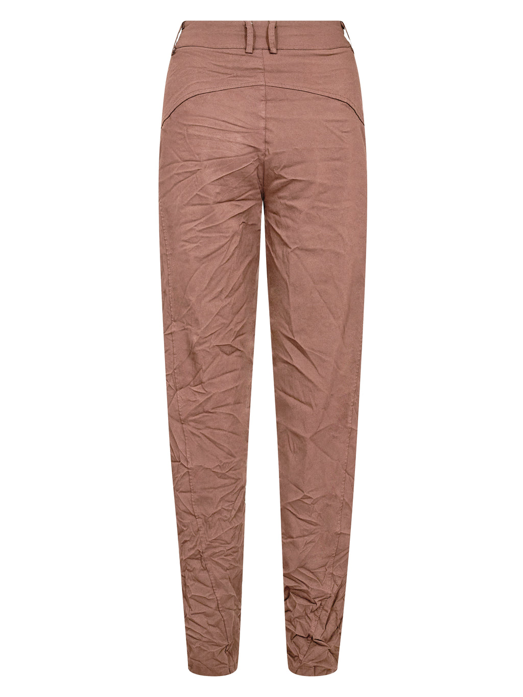 These pants are designed with a slim leg and a distinctive waistband, giving a simple and timeless look. At the front, they have a diagonal button closure and a belt with a metal ring, adding a clean and stylish detail play. At the back, the cut is clean with belt loops and markings that emphasize the fit. Style them with a lightweight knit or a shirt for a relaxed yet polished everyday look.
