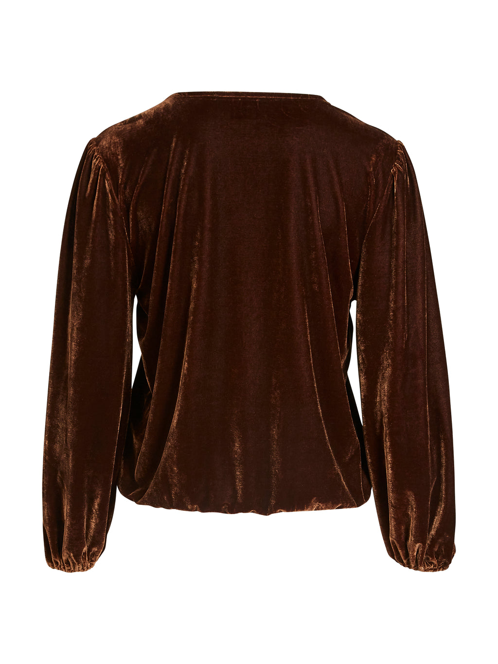 This wrap blouse combines comfort and elegance with its soft, velour-like material and flattering design. It features long sleeves with elastic at the wrists and a decorative, asymmetric wrap-effect at the front, creating a nice draping over the body. The wide elastic at the bottom ensures a good fit and a rounded expression.