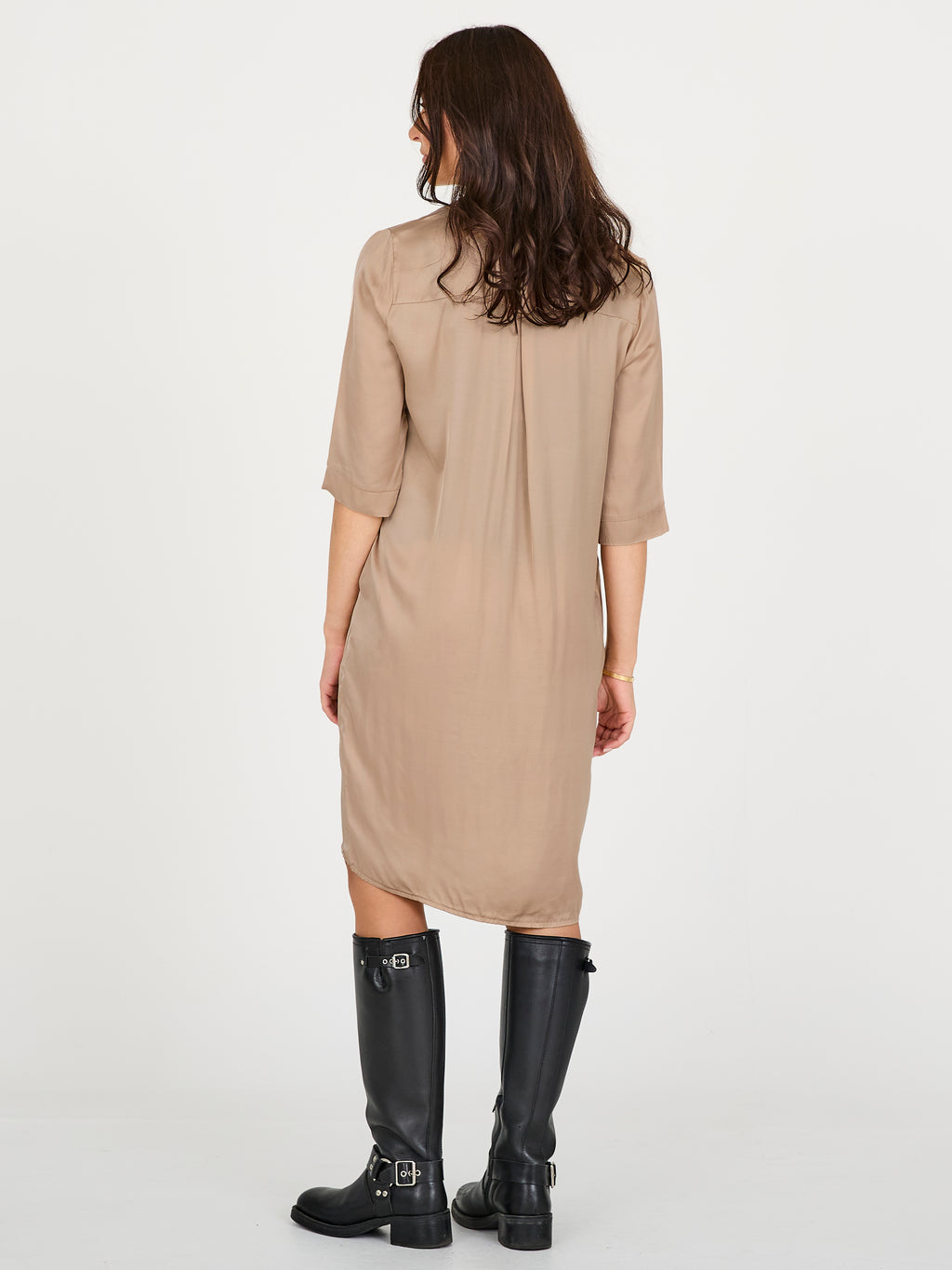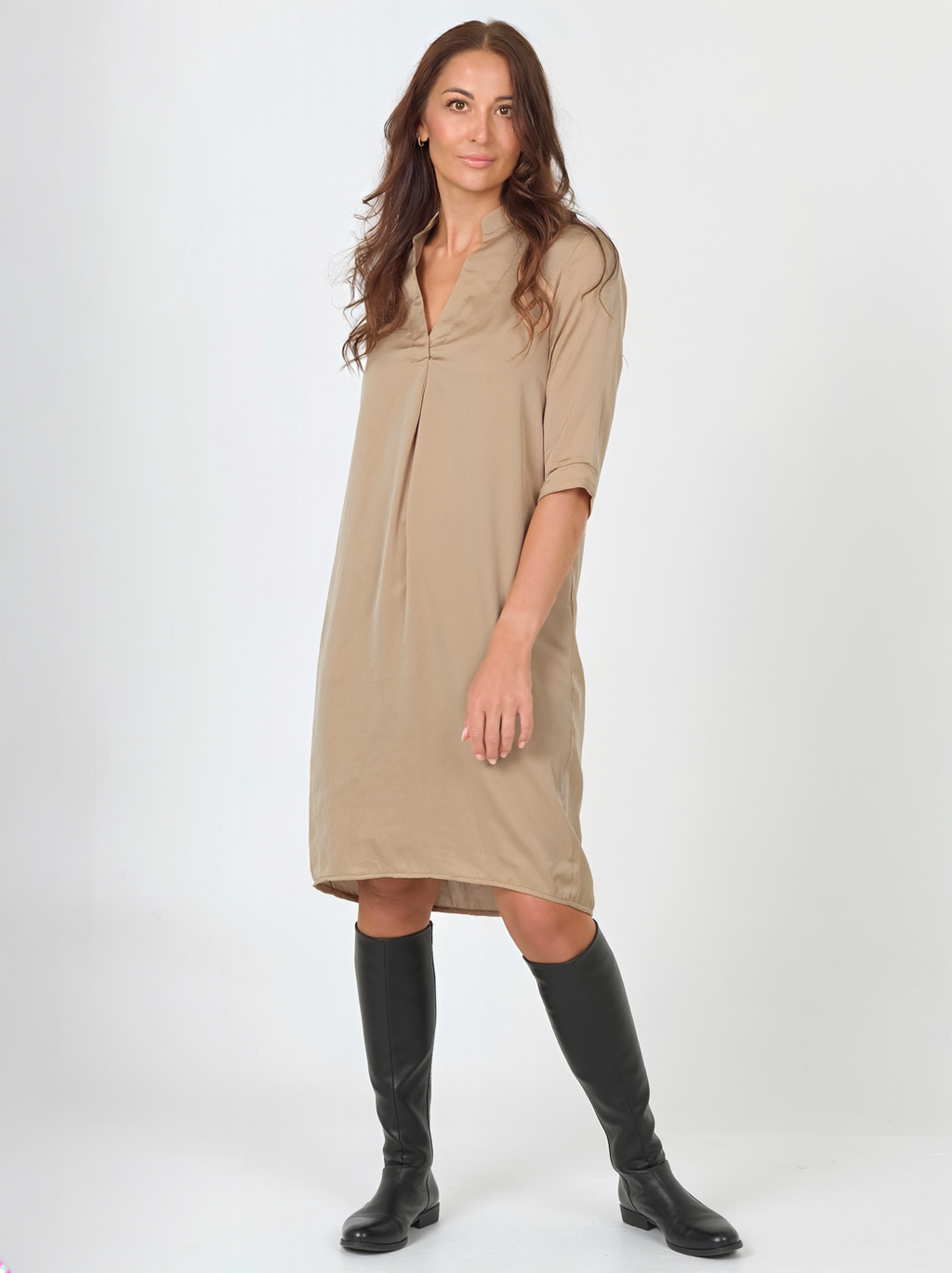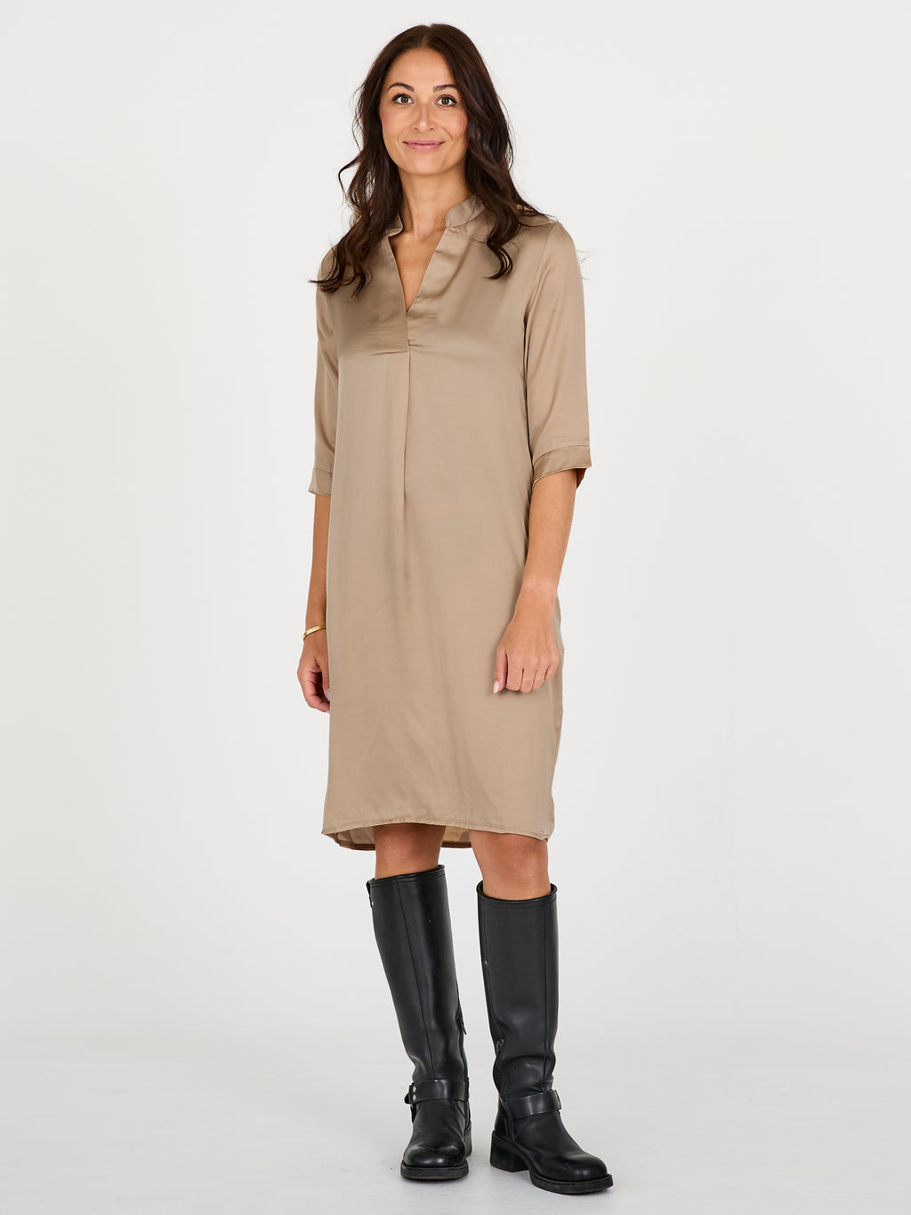 Create an elegant and effortless look with this loosely fitted dress in a smooth, slightly shiny material. It features a simple V-neck and a collar with a Chinese-inspired cut, as well as 3/4-length sleeves that emphasize the minimalist design. A discreet pleat in the back provides extra freedom of movement and a beautiful drape.