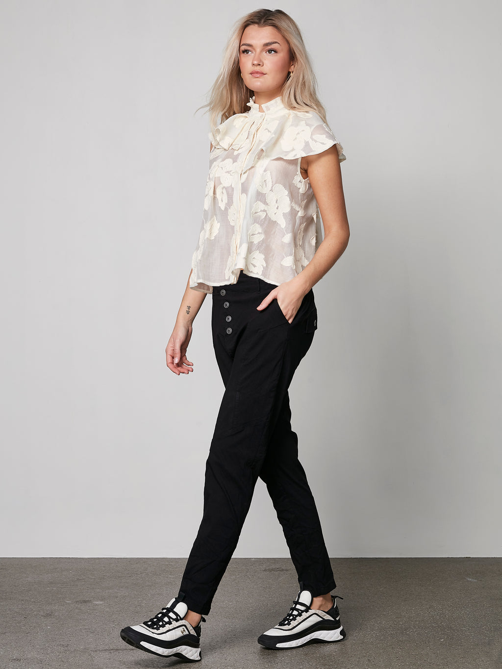 These trousers are perfect for both formal and casual occasions. For a sophisticated everyday look, try combining them with a shirt and some simple jewelry. The trousers' side pockets give them a practical touch, while the unique front button closure adds a modern twist.