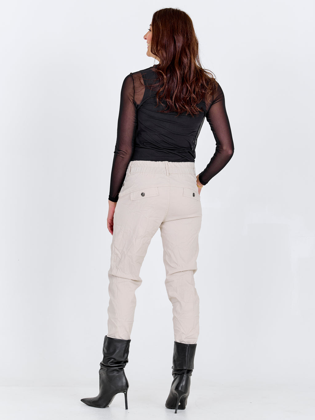 These trousers are perfect for both formal and casual occasions. For a sophisticated everyday look, try combining them with a shirt and some simple jewelry. The trousers' side pockets give them a practical touch, while the unique front button closure adds a modern twist.