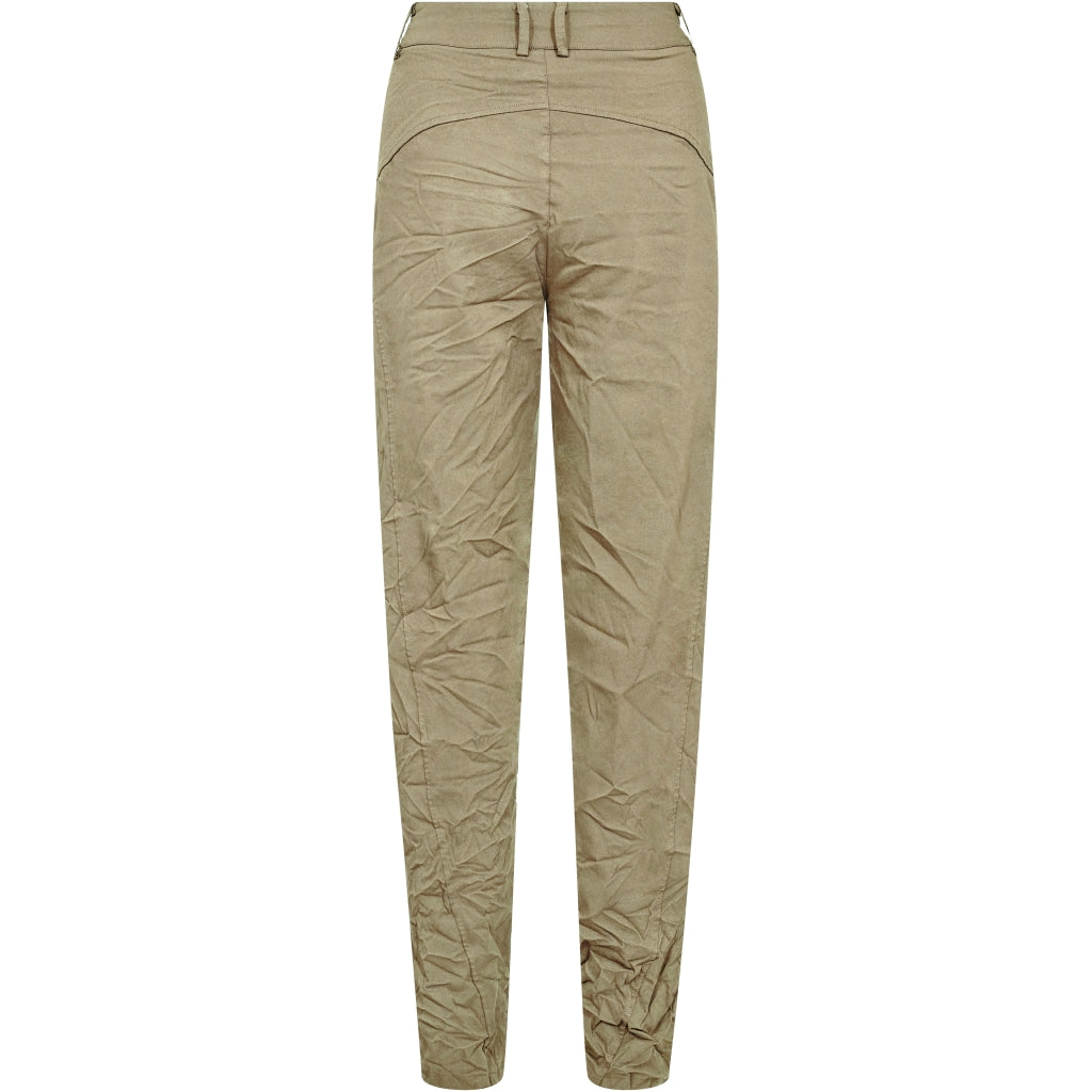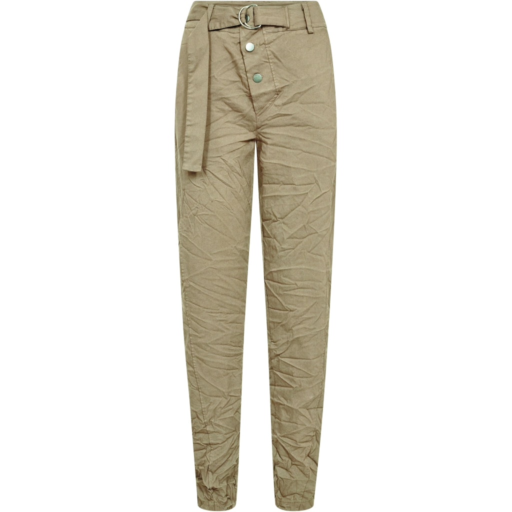 These pants are designed with a slim leg and a distinctive waistband, giving a simple and timeless look. At the front, they have a diagonal button closure and a belt with a metal ring, adding a clean and stylish detail play. At the back, the cut is clean with belt loops and markings that emphasize the fit. Style them with a lightweight knit or a shirt for a relaxed yet polished everyday look.