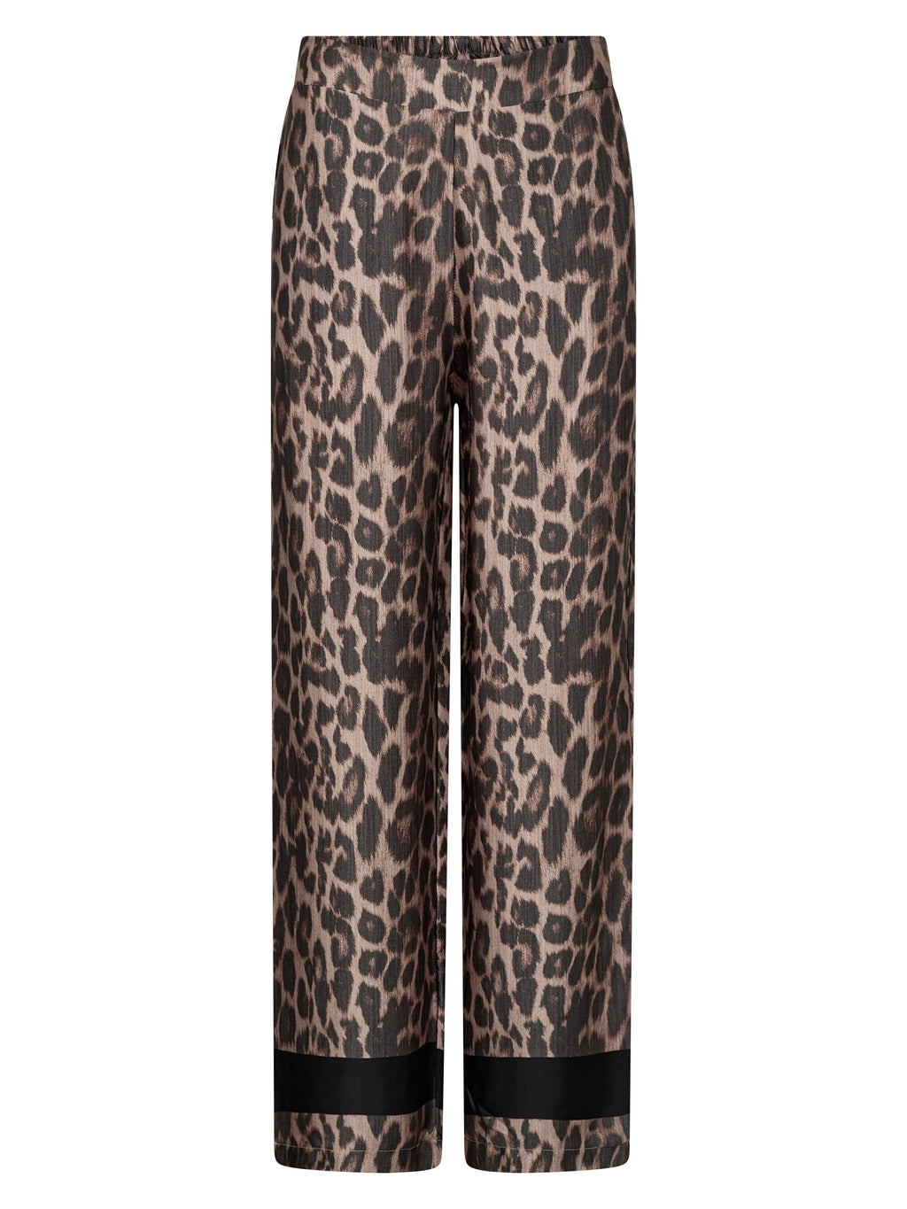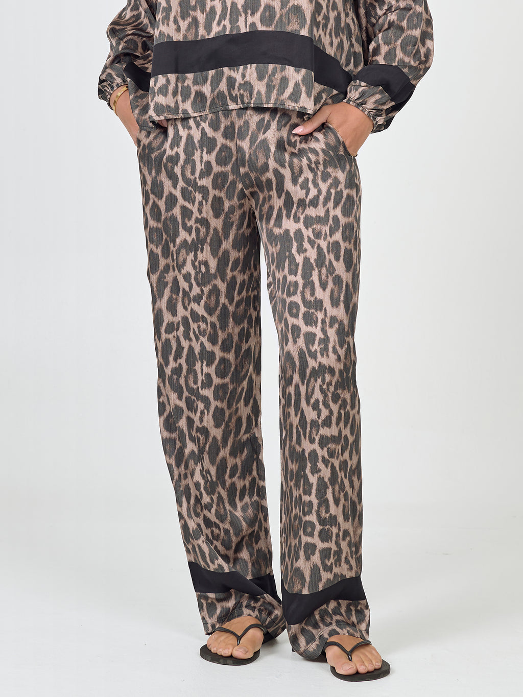 These trousers have straight, wide legs that provide a relaxed and comfortable fit. They are designed with an elastic waist for extra freedom of movement and have a wide contrast trim at the bottom, adding a modern touch. The lightweight material makes them comfortable to wear all day.