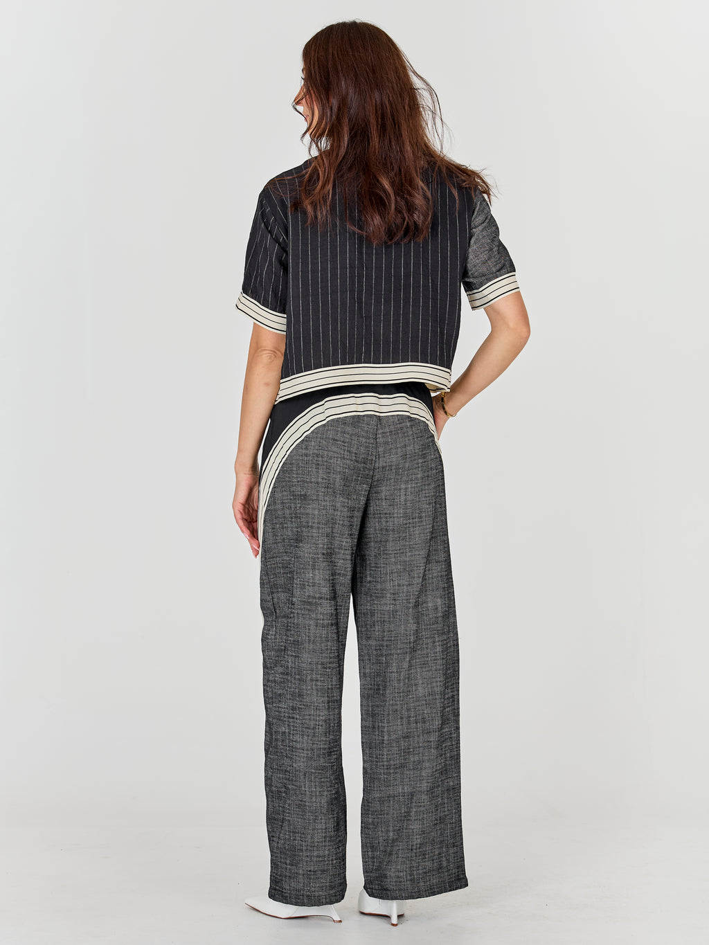 A sporty design meets structured contrast in these wide-leg trousers. The front features a smooth material with decorative stripes down the legs, while the back offers a coarser, woven quality, providing an exciting interplay. The trousers have elastic and a drawstring at the waist ensuring a good fit and high comfort.