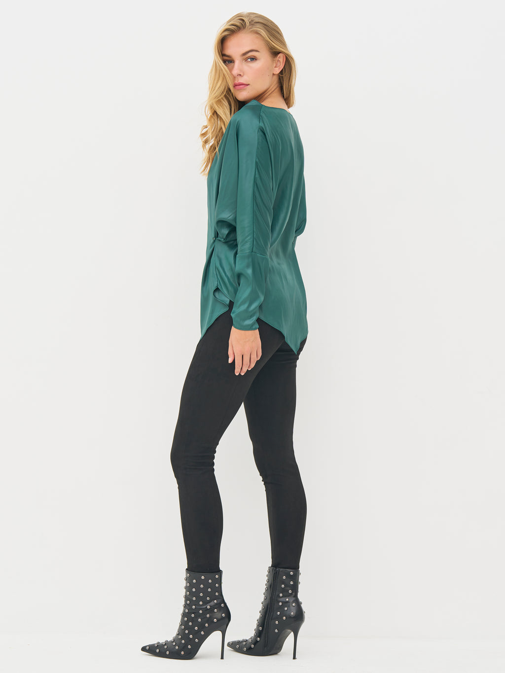 Add a modern twist to the wardrobe with this soft, shiny blouse. It has a loose fit and a special pointed skirt that creates a flattering and eye-catching silhouette. The sleeves are long with a wide cuff and a light ruching, adding extra character to the simple design.