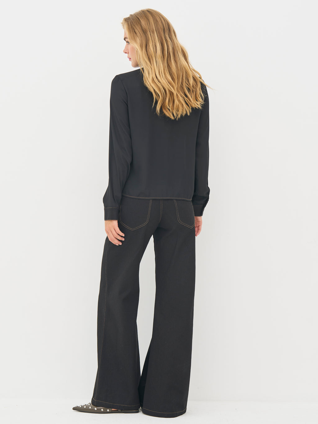 This denim shirt combines a classic cut with modern details. It features a button closure at the front, chest pockets with flaps, and distinctive contrast stitching that highlights the design's structure. The material is light and soft, making the shirt comfortable for both layering and wearing alone as a light jacket.