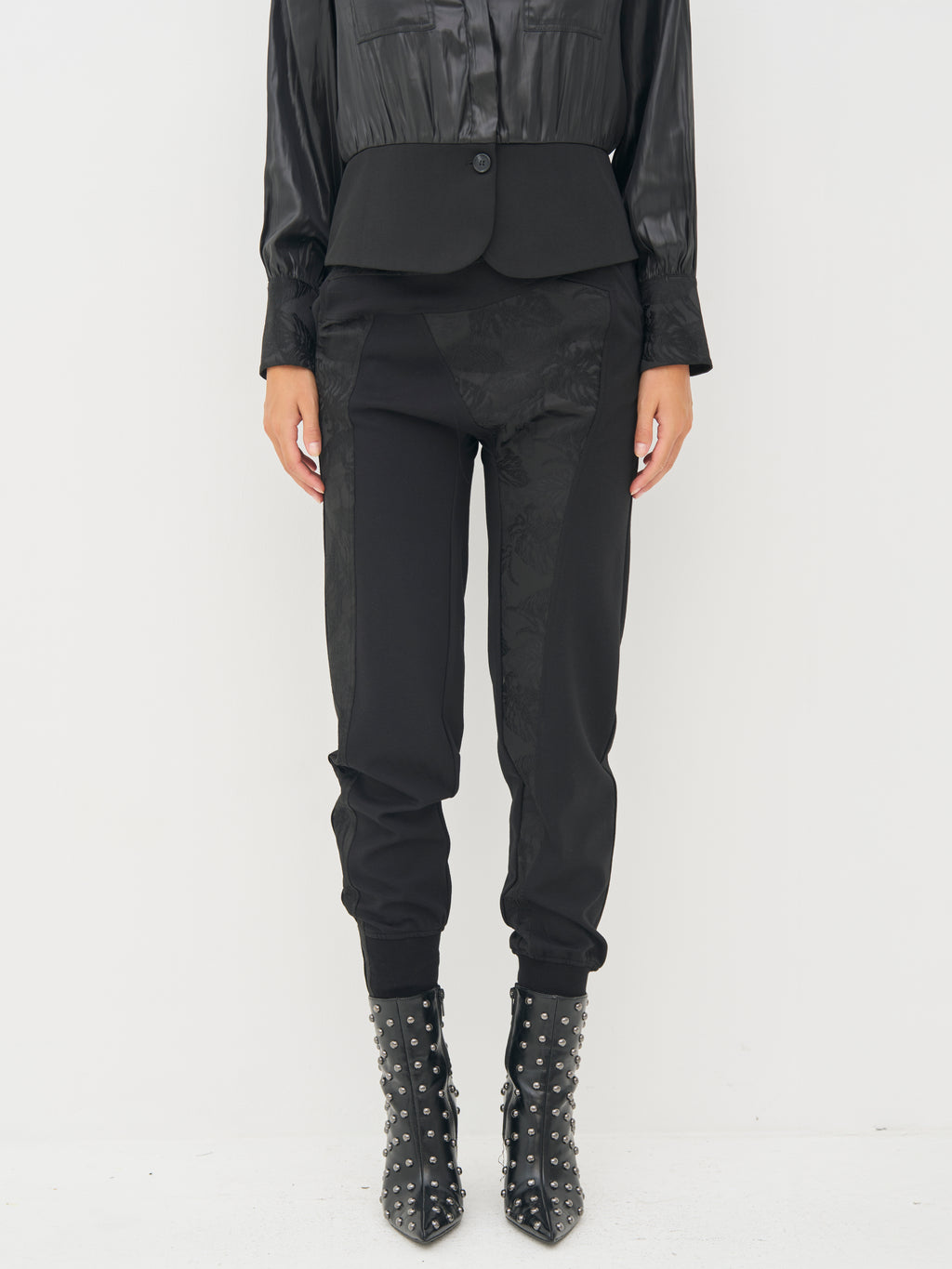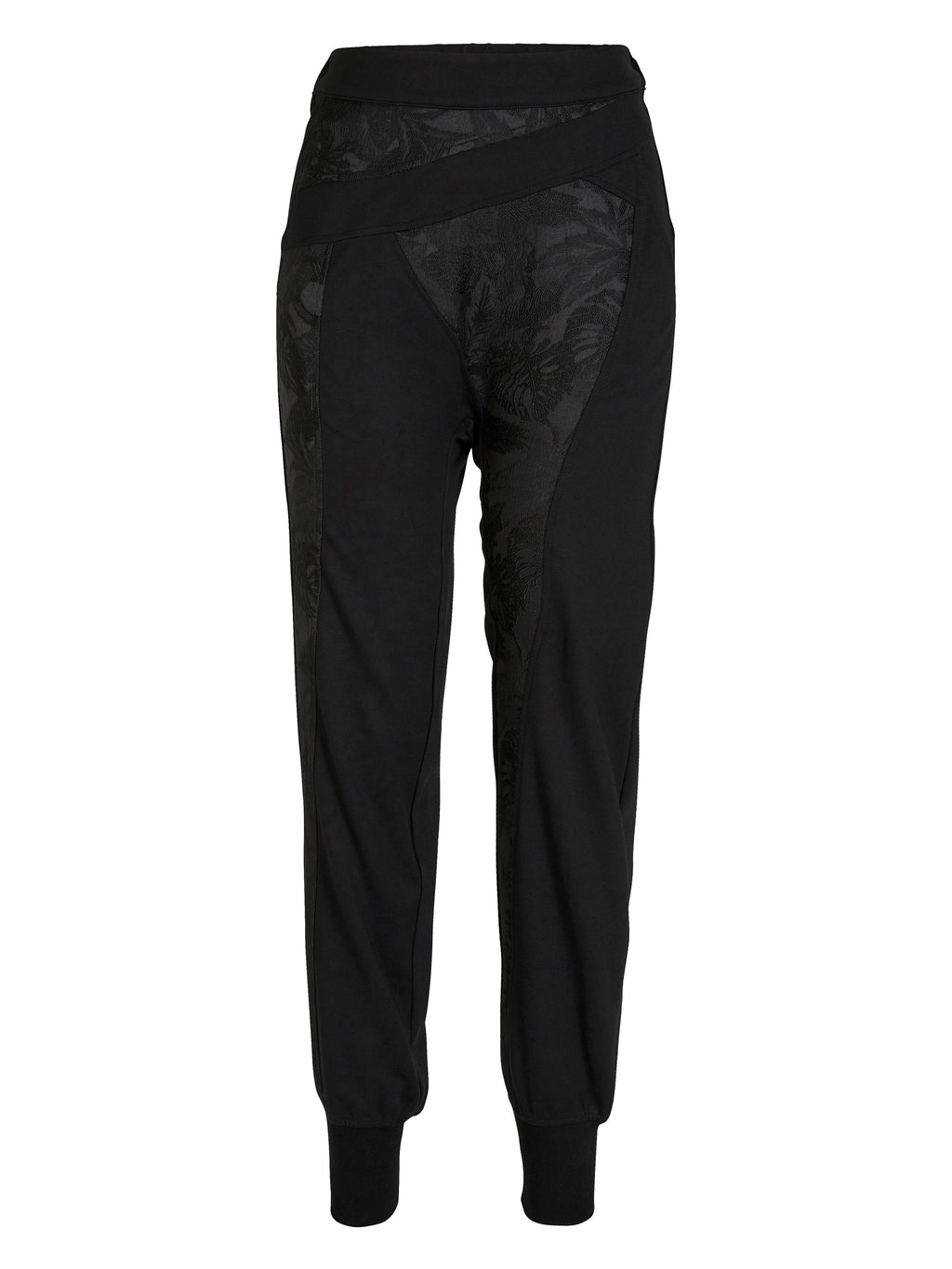 These trousers combine comfort and style with their soft material and decorative structural panels at the front. The fit is relaxed with narrow ribbed cuffs at the ankles and an elastic waistband at the back providing extra mobility. The slanted design at the waist and discreet back pockets complete the sporty look.