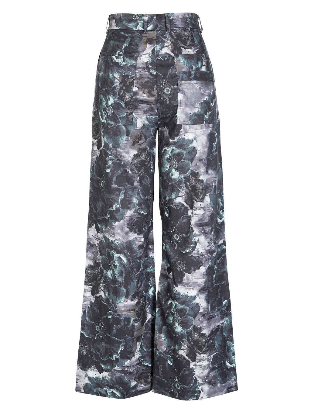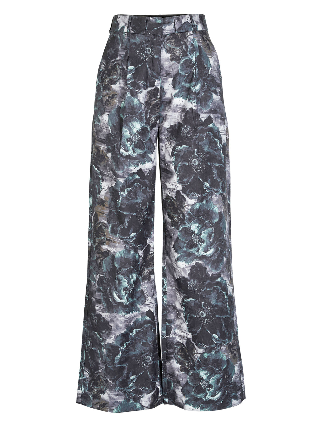 Give your outfit an artistic touch with these pants featuring a bold floral print. The wide leg width creates an elegant silhouette, while pleats and side pockets add structure and functionality. The closure consists of a zipper, inner hook, and button, as well as an elastic waistband on the inside, ensuring a comfortable and flexible fit.