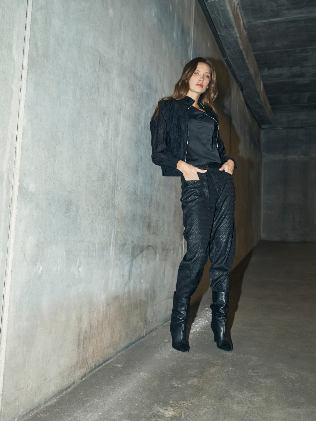 Add a feminine twist to your wardrobe with this lightweight jacket featuring embroidered flowers and beautiful transparent details. The jacket has a high collar, front zip closure, and gathers at the shoulders, creating a voluminous look. The wide elastic at the waist and cuffs gives the jacket a flattering shape and a comfortable fit.