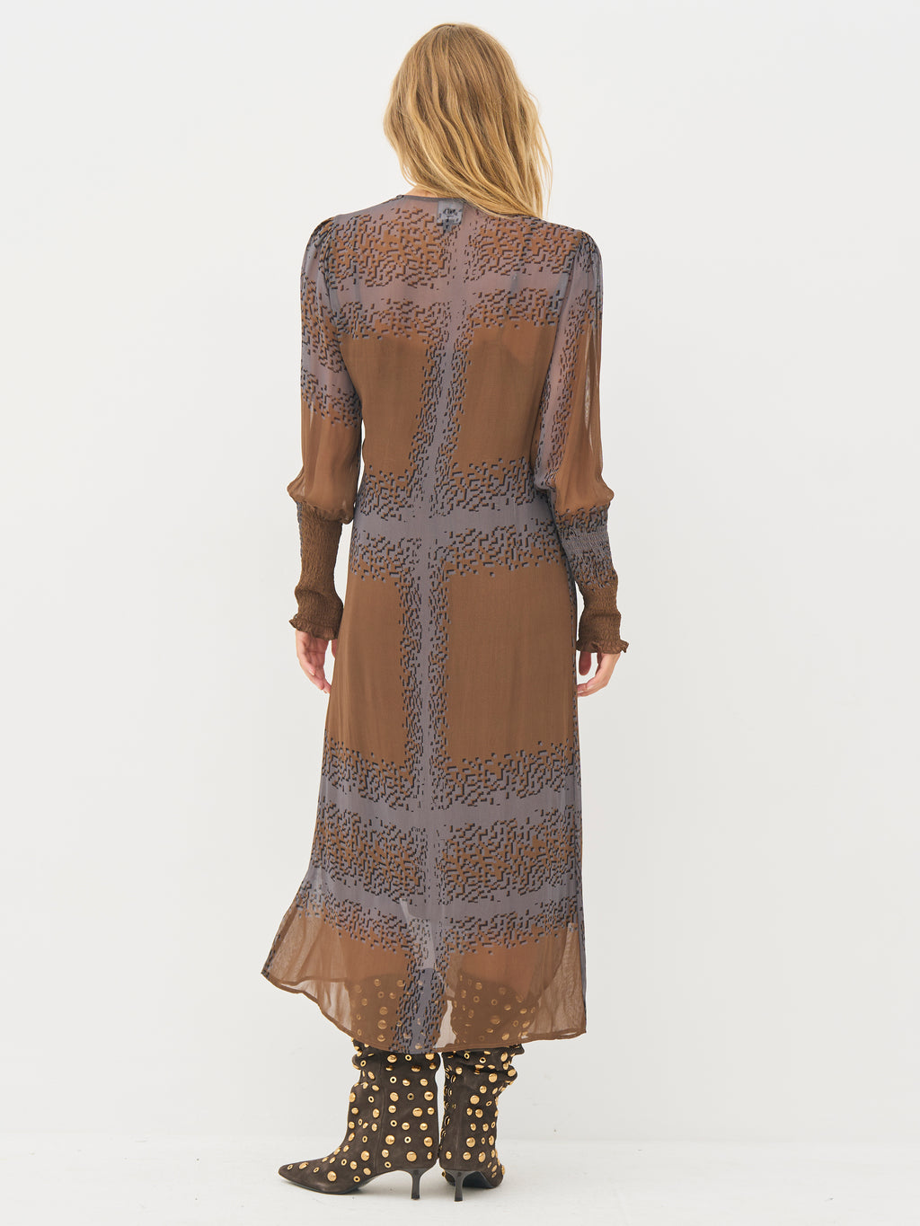 This dress combines lightness and structure with its delicate, transparent material and graphic pattern. It features a wrap-around effect with a tie at the waist and long sleeves with smocking and delicate ruffle edges, adding a feminine detail. The included slip ensures comfortable coverage.