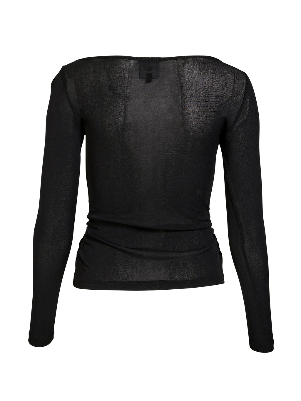 Create an elegant and simple expression with this long-sleeved t-shirt in a lightweight, transparent material. The close-fitting cut accentuates the figure, while the delicate wrinkles on the sides add subtle detail and movement. The boat-shaped neckline gives the t-shirt a feminine touch and makes it easy to style for both daytime and evening.