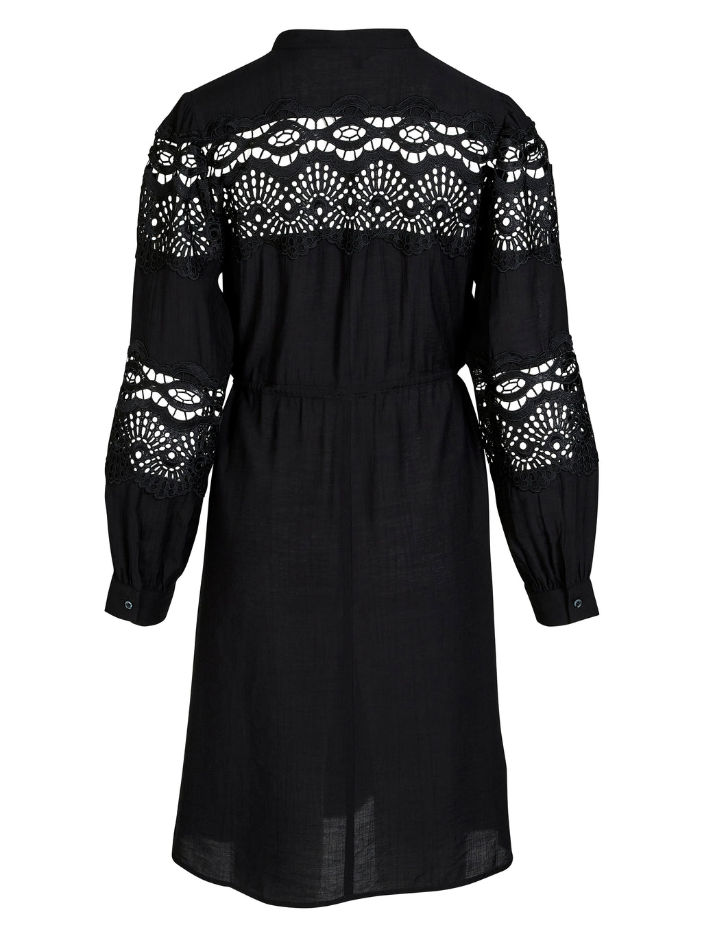 This dress combines romantic details with a relaxed silhouette. The beautiful lace sections over the chest, shoulders, and sleeves create a feminine expression, while the tie belt at the waist allows for an adjustable fit. The long sleeves are finished with cuffs and buttons, adding a classic touch.