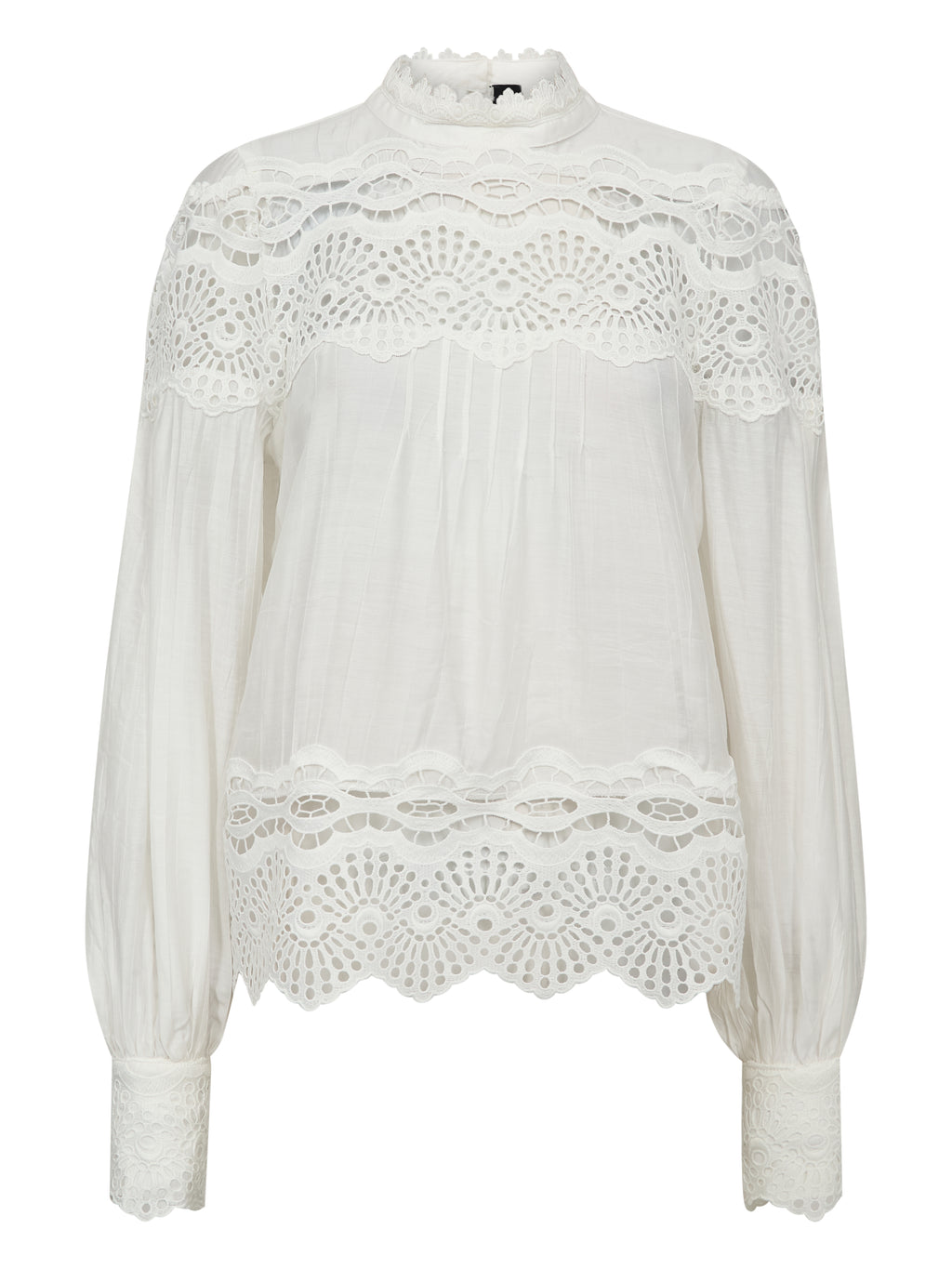 Get a refined and romantic expression with this beautiful shirt that combines classic cuts with decorative lace details. The broad lace ribbons adorn both the chest, back, cuffs, and hem, creating an elegant interplay between transparency and density. The small stand-up collar and button closure at the back add a stylish finish.