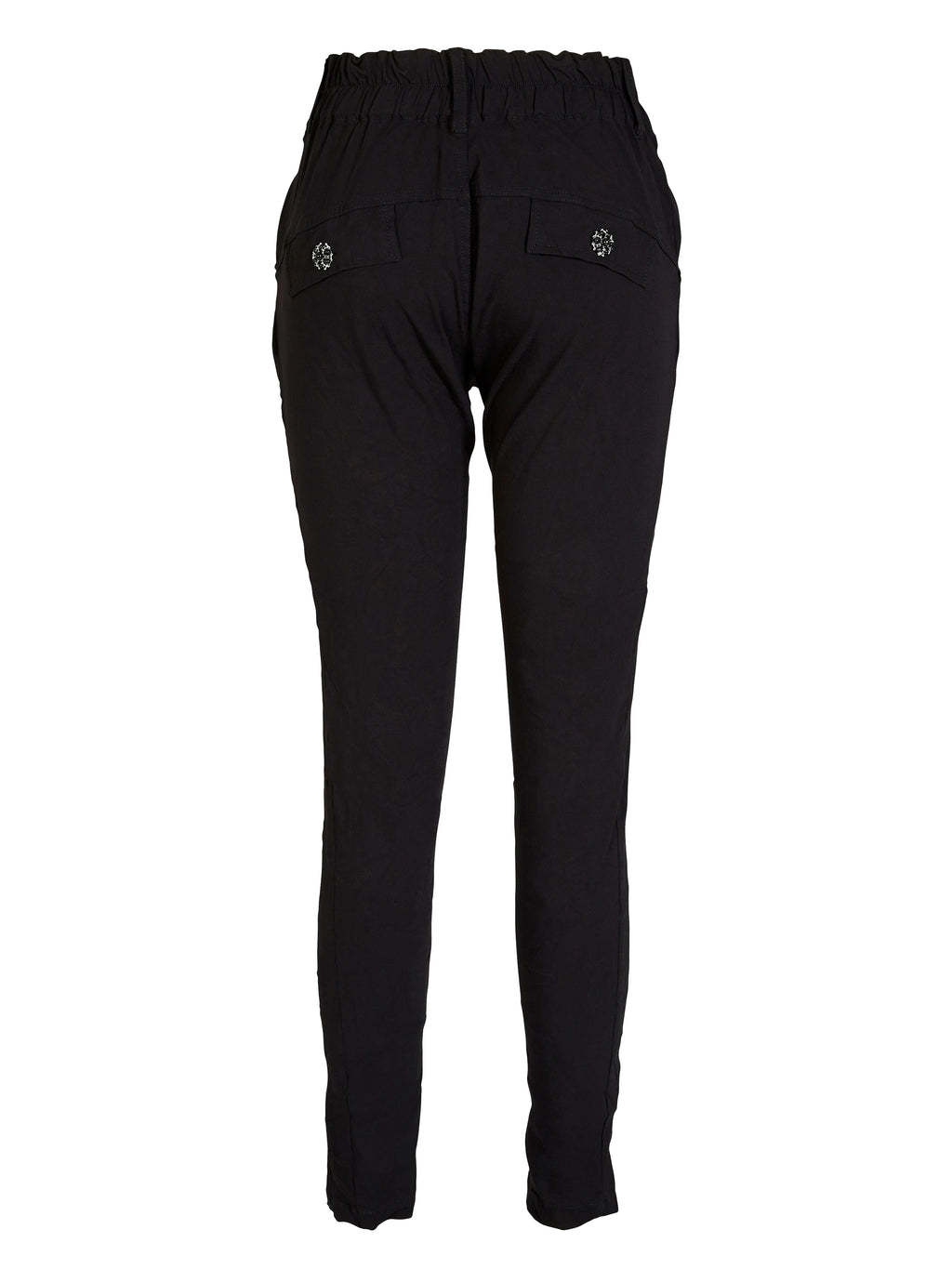 These trousers have a slim fit and decorative details, giving an elegant and modern expression. The off-center front buttons with sparkling stones create a striking element, while the elastic at the back ensures a comfortable fit. The slanted seams and flap back pockets complete the stylish design.
