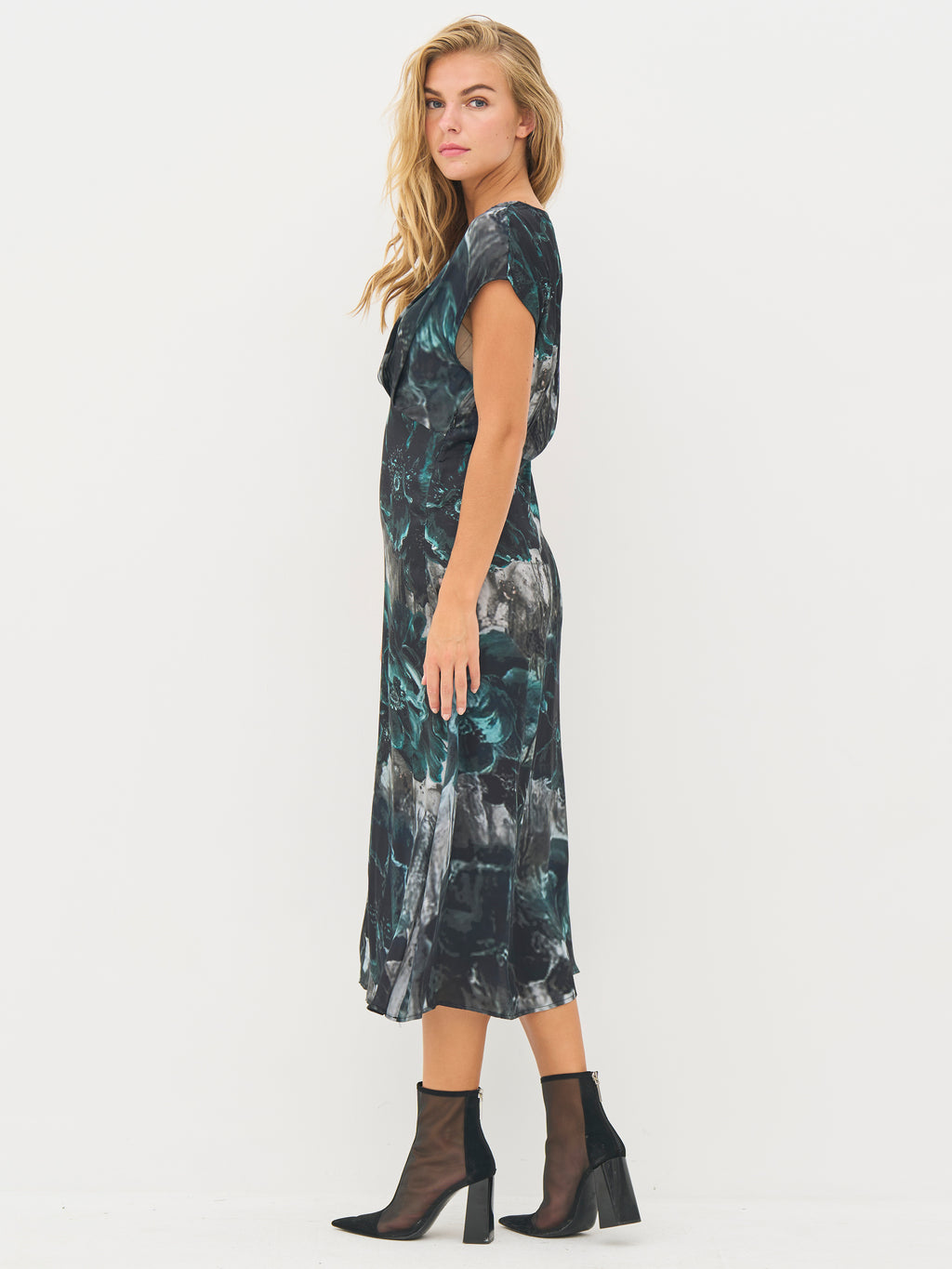 An elegant choice for both everyday wear and festive occasions. This long dress has a beautiful drape and a feminine cut with a lightly defined waist. The soft fabric follows the body in a flattering way, while the eye-catching floral print adds depth and character to the design. The short sleeves and round neckline provide a simple and timeless expression.