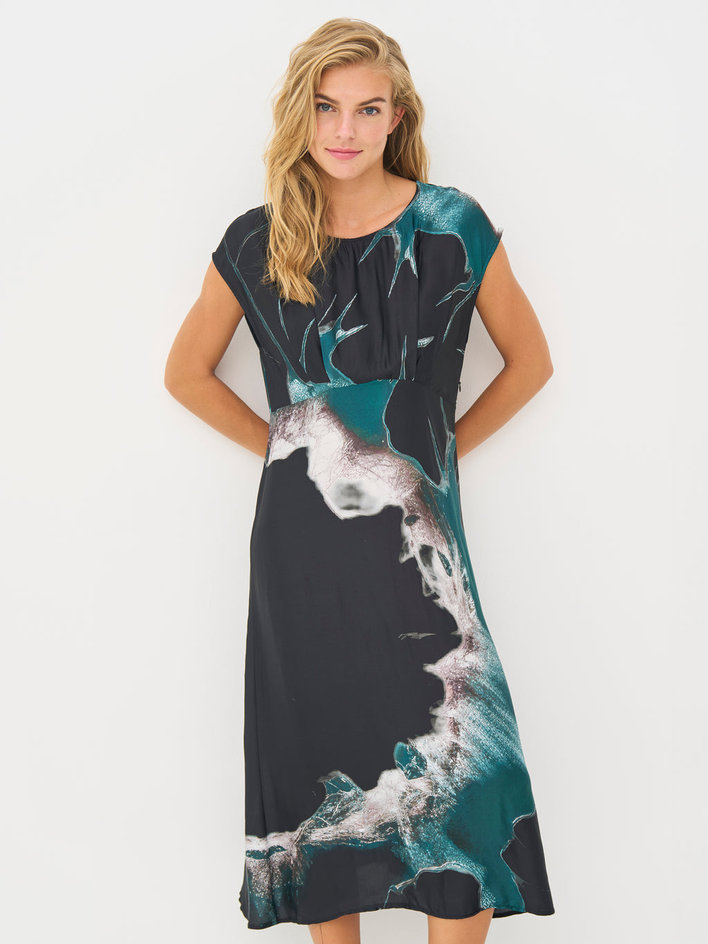 An elegant choice for both everyday wear and festive occasions. This long dress has a beautiful drape and a feminine cut with a lightly defined waist. The soft fabric follows the body in a flattering way, while the eye-catching floral print adds depth and character to the design. The short sleeves and round neckline provide a simple and timeless expression.
