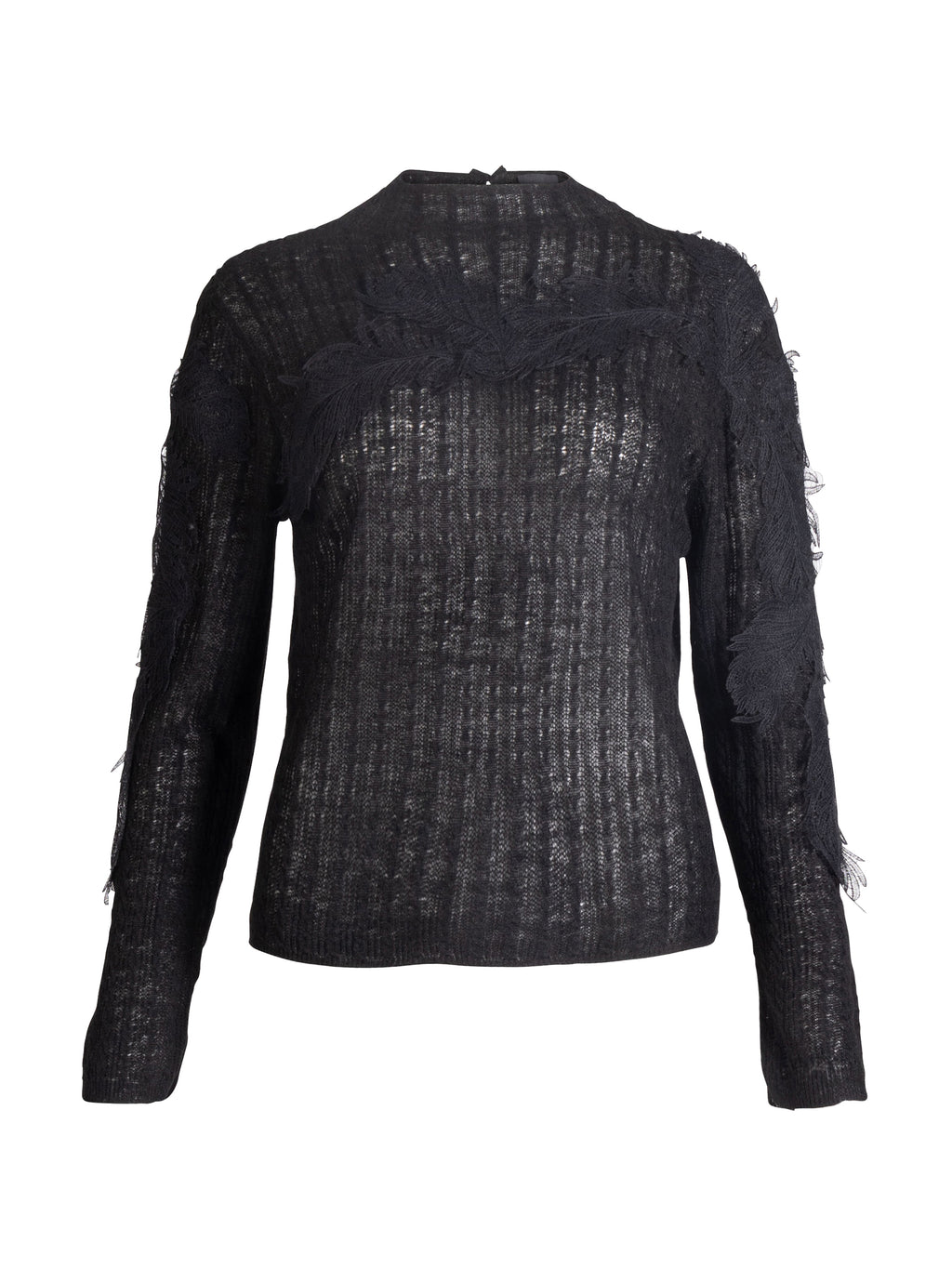 Add an artistic touch to the wardrobe with this structured blouse. The lightly transparent material has a vertical weave, creating a subtle play effect in the fabric. The blouse is decorated with tone-on-tone fringe details on the front and along the sleeves, adding a special depth and movement to the design. It closes at the neck with a small button and features a simple round neckline.