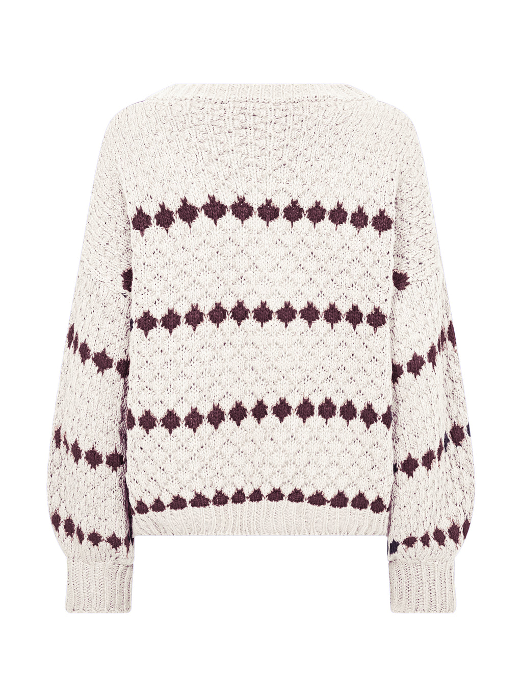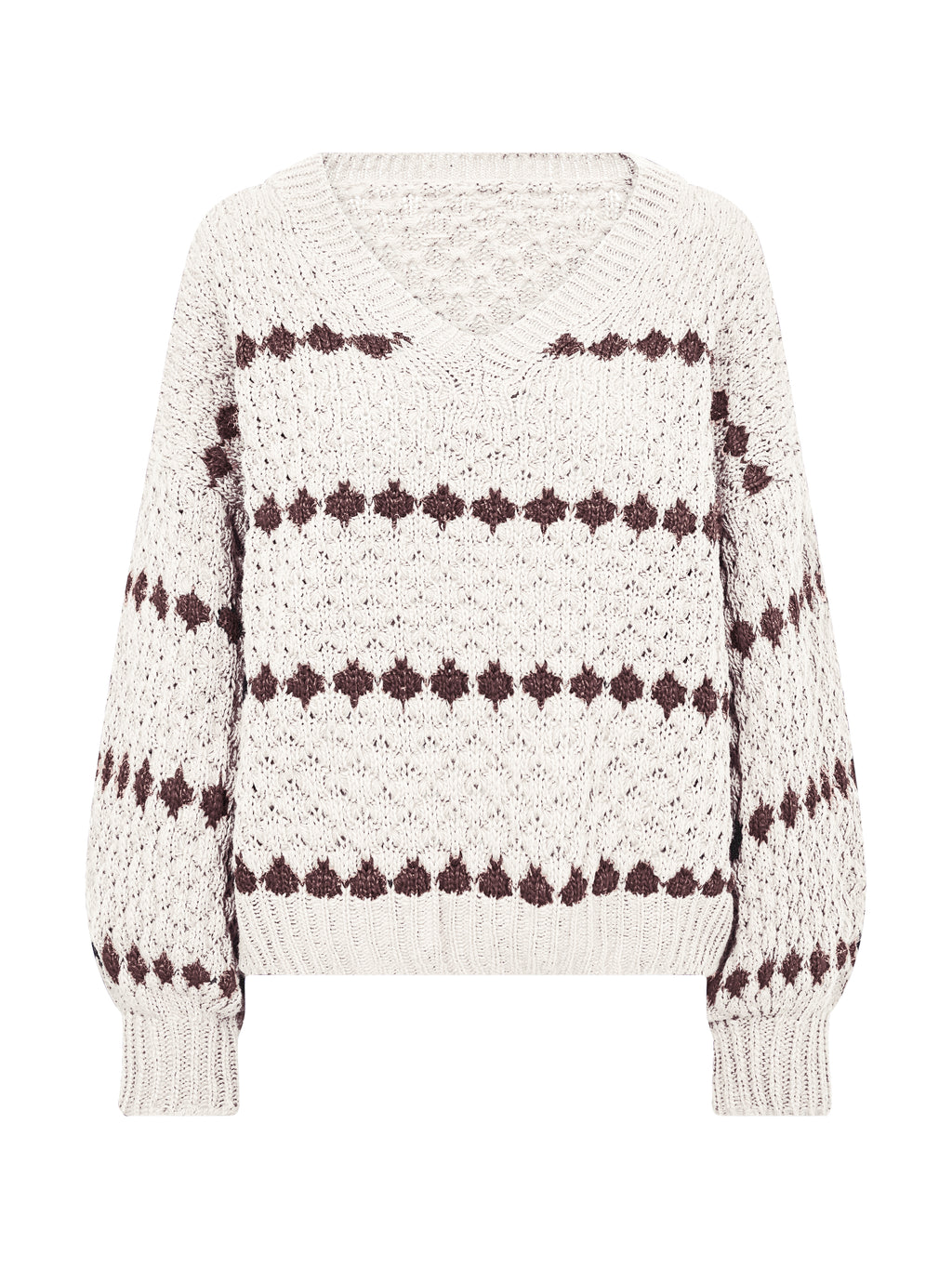 The sweater has nice details and a classic look. It features a v-neck, long sleeves, and a pattern-knitted design with stripes, adding character to the knitwear. The fit is regular with ribbing at the bottom and on the sleeves, finishing the look in a simple way.