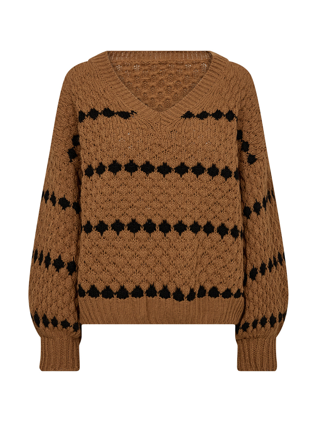 The sweater has nice details and a classic look. It features a v-neck, long sleeves, and a pattern-knitted design with stripes, adding character to the knitwear. The fit is regular with ribbing at the bottom and on the sleeves, finishing the look in a simple way.