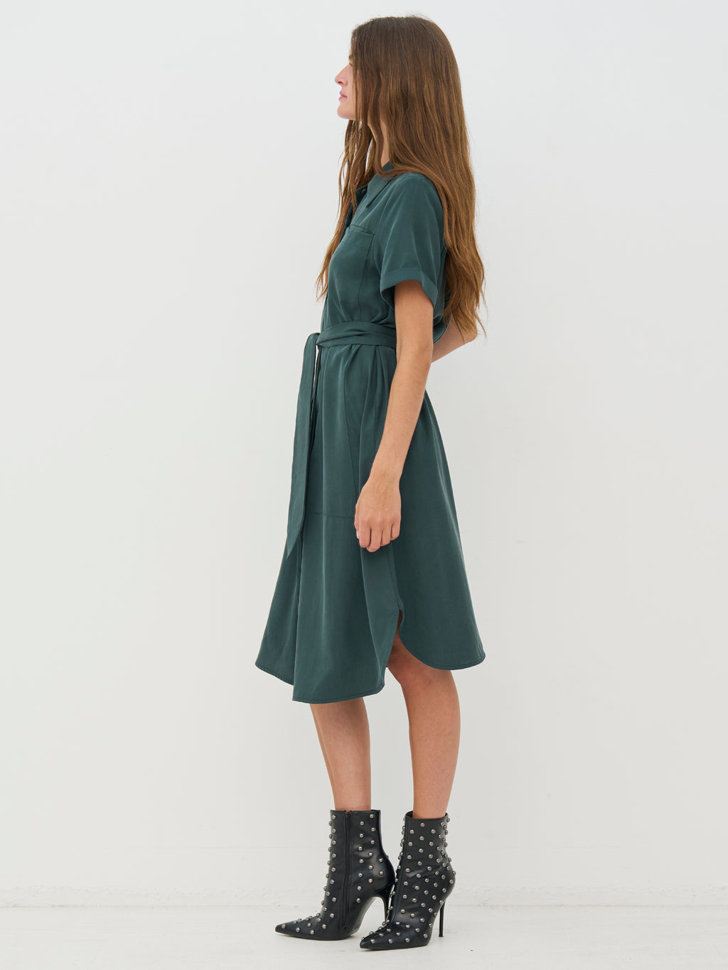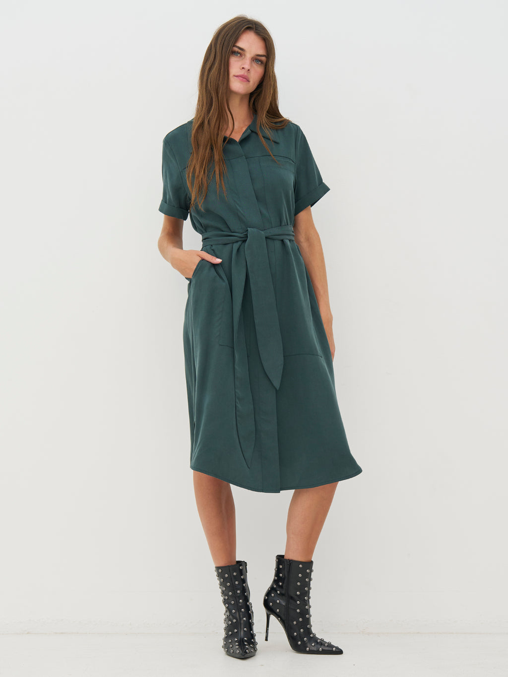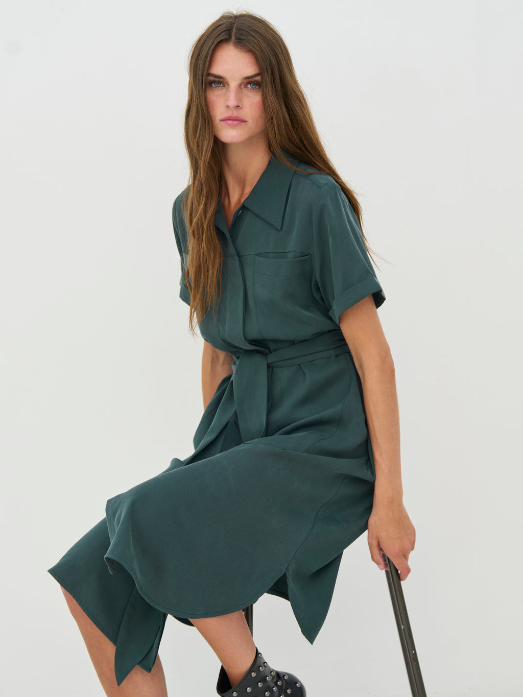 This dress has an elegant and relaxed look with its shirt collar, 3/4-length sleeves, and clean lines. The wide belt at the waist allows for shaping the silhouette, while the delicate pleats at the front add gentle movement to the skirt. At the back, the dress has a soft falling fit and small slits on the sides, providing extra comfort. Style it with sandals for a relaxed look or with boots for a more striking appearance.