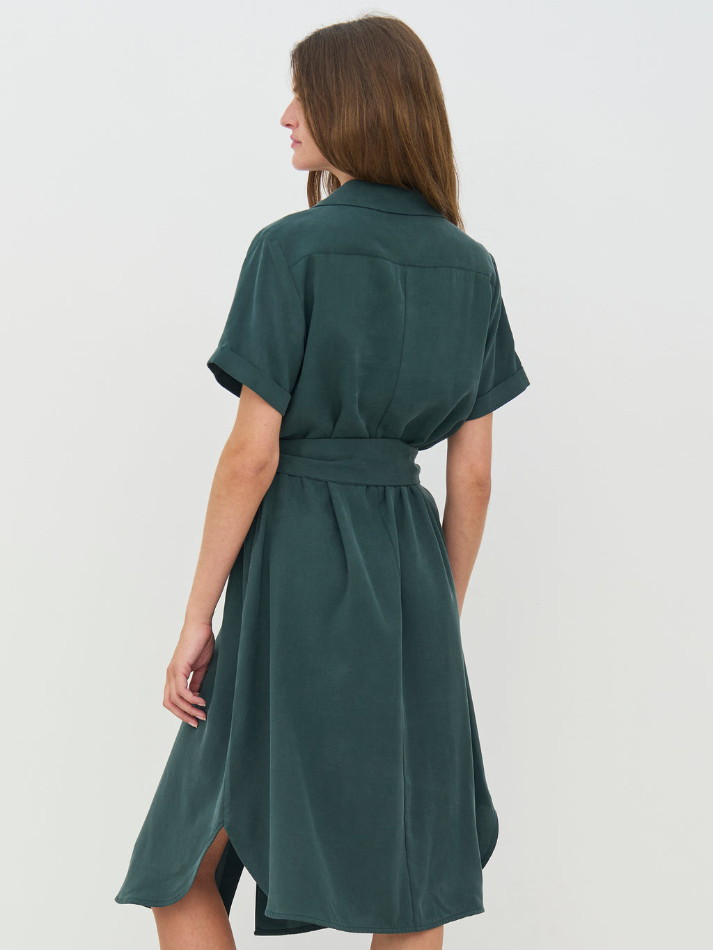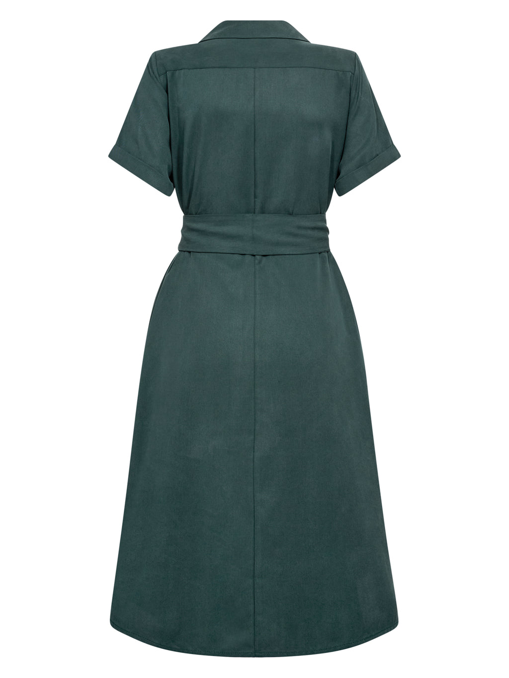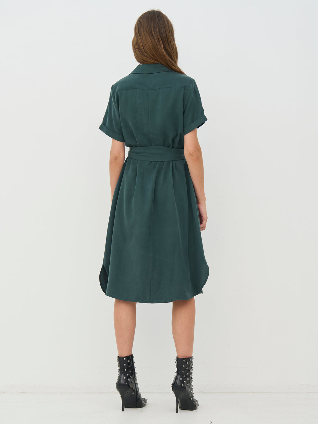 This dress has an elegant and relaxed look with its shirt collar, 3/4-length sleeves, and clean lines. The wide belt at the waist allows for shaping the silhouette, while the delicate pleats at the front add gentle movement to the skirt. At the back, the dress has a soft falling fit and small slits on the sides, providing extra comfort. Style it with sandals for a relaxed look or with boots for a more striking appearance.