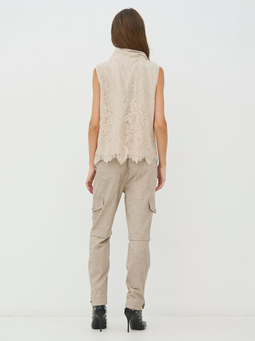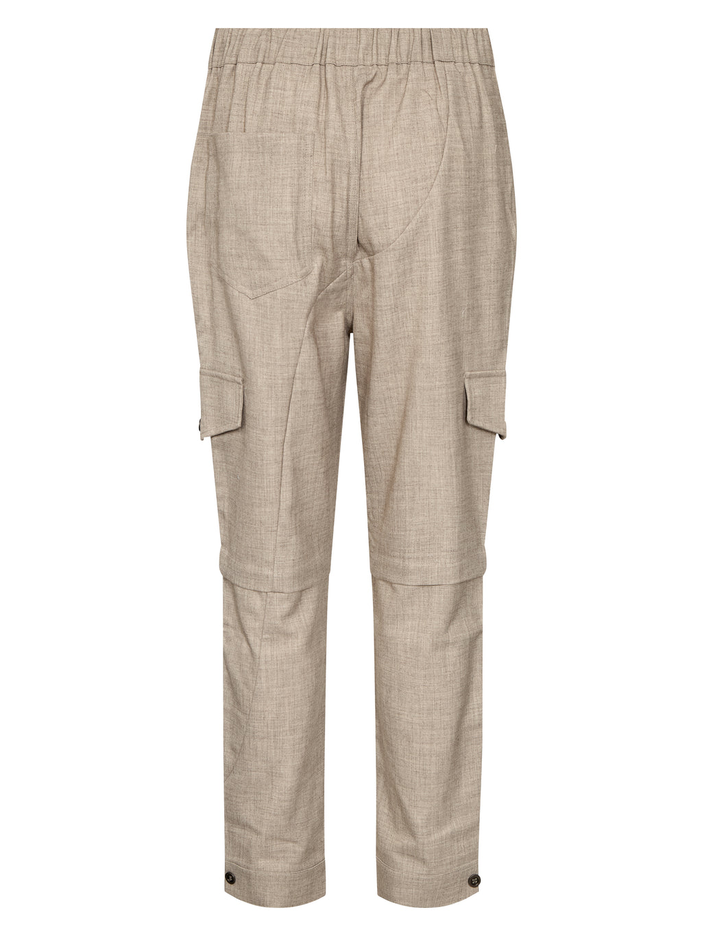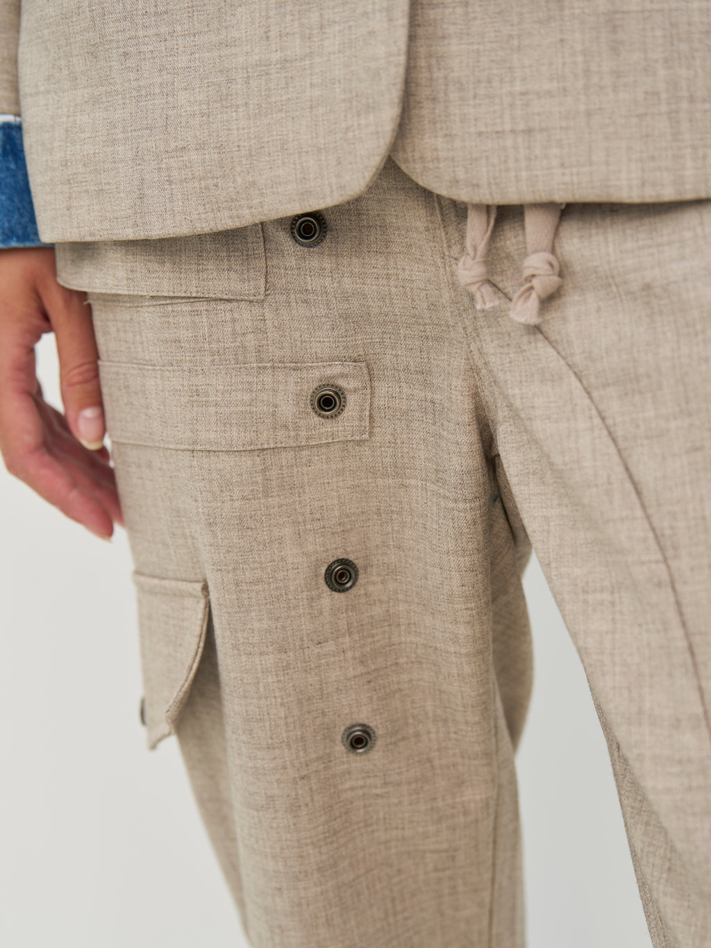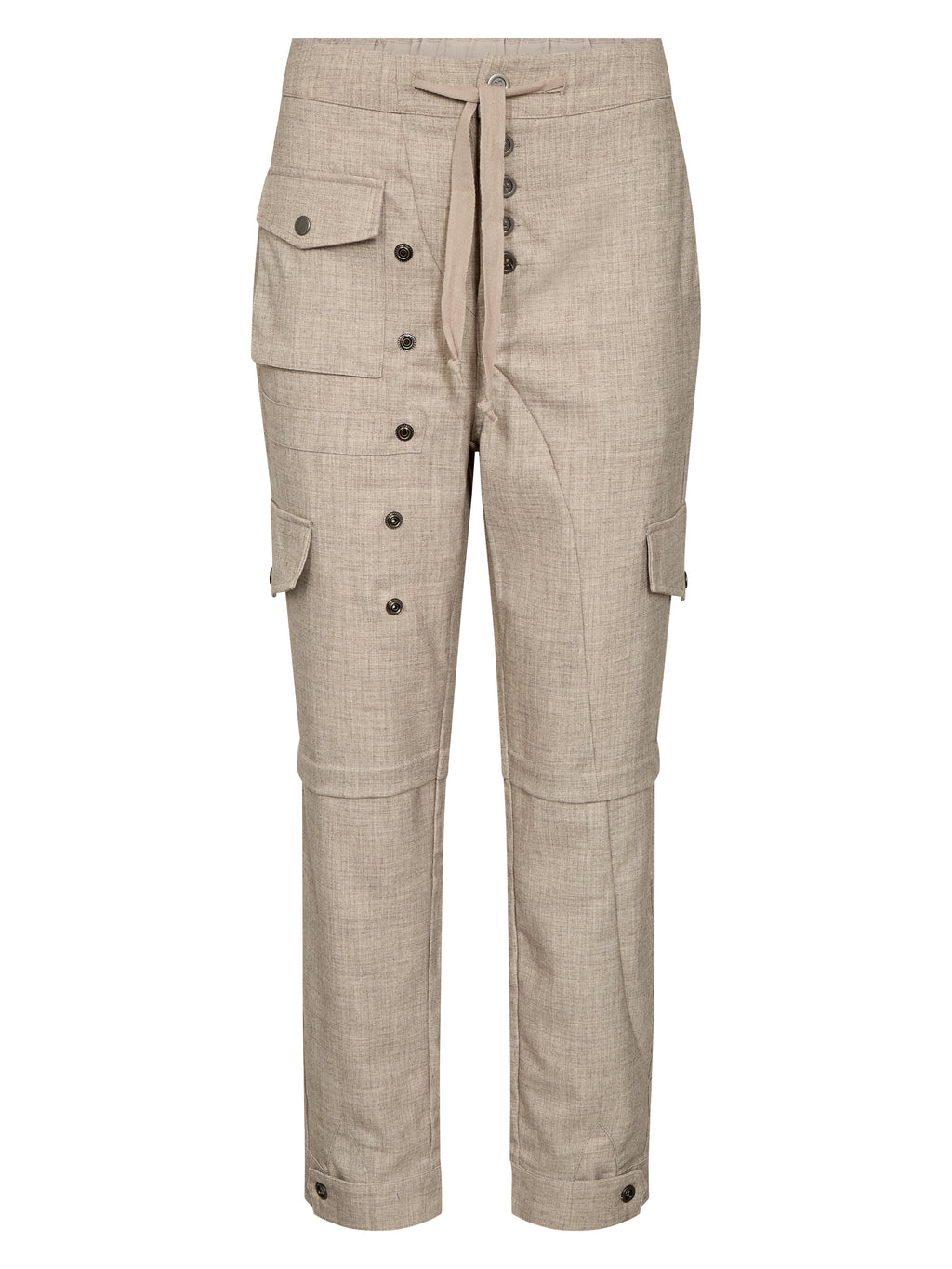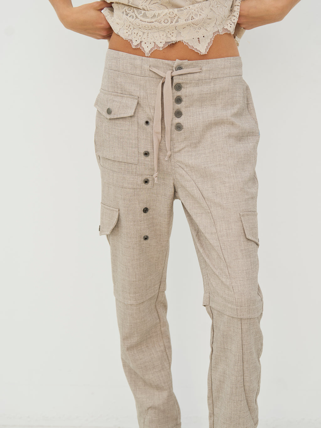 These pants feature a modern design with multiple practical pockets and decorative buttons, providing a striking and detailed look. At the front, they have a button closure combined with an adjustable drawstring at the waist for a comfortable fit. Style them with a simple top or a light shirt for a cool and effortless everyday look.