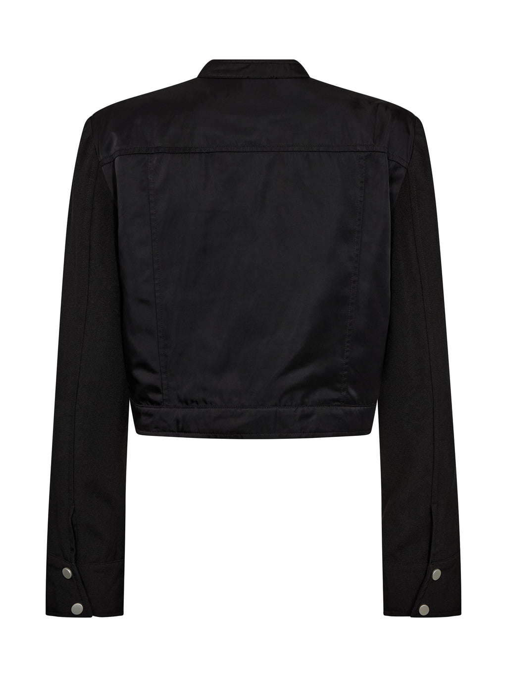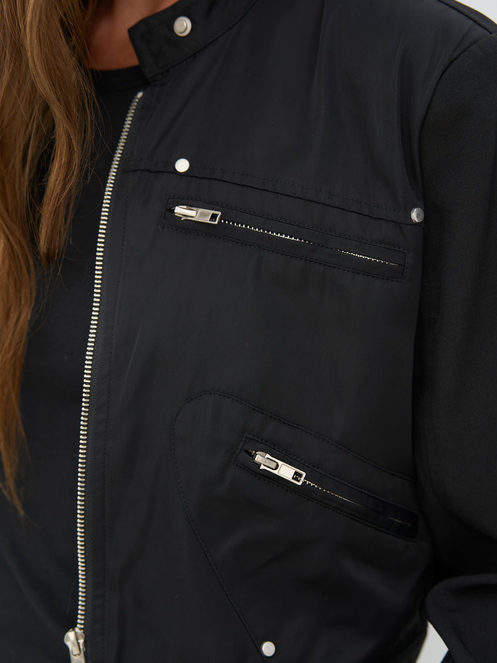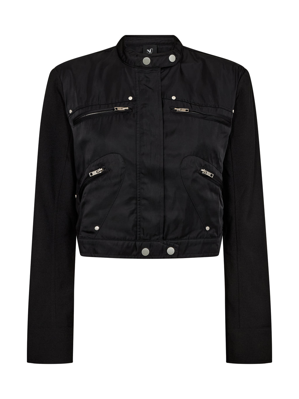 This jacket has a modern, cool expression with its short length and the combination of matte and glossy materials. At the front, it features multiple zippers and snap buttons that add both function and character to the design. The high collar with snap button gives a sharp look, while the long sleeves round off the look in a classic way. At the back, the jacket is kept simple with clean lines. Style it over a top, dress, or light knit for a stylish everyday look with an edge.