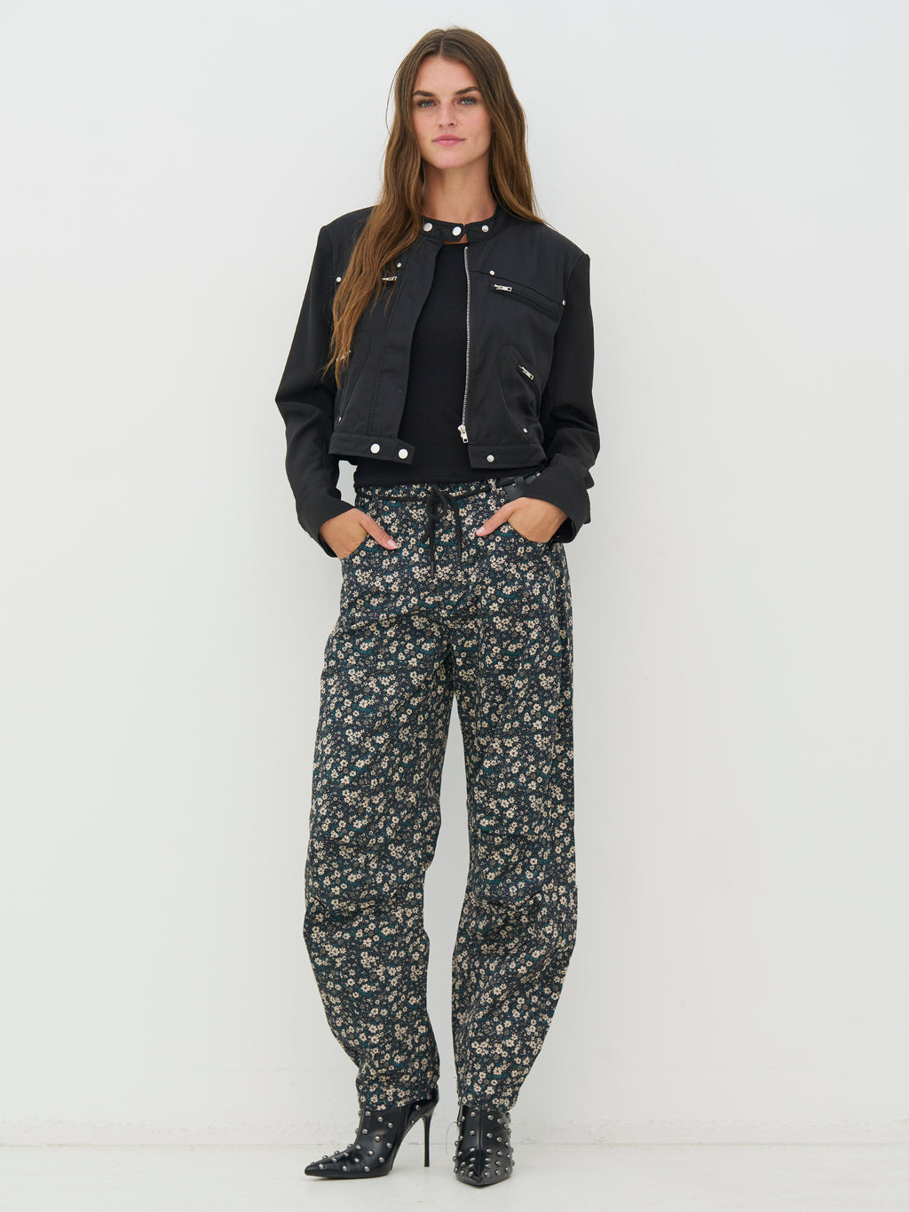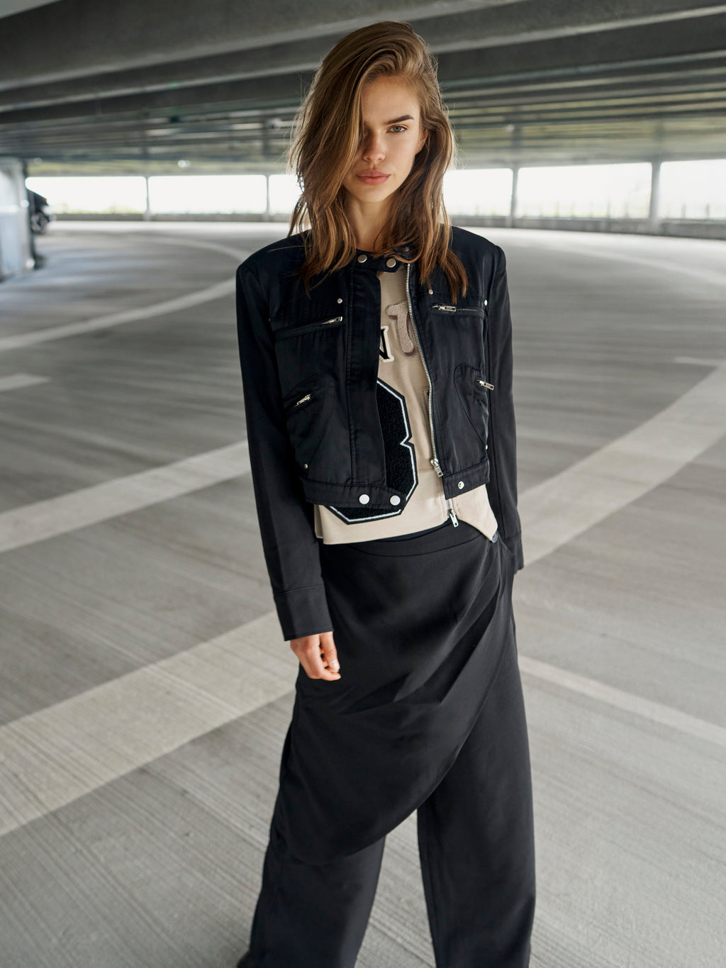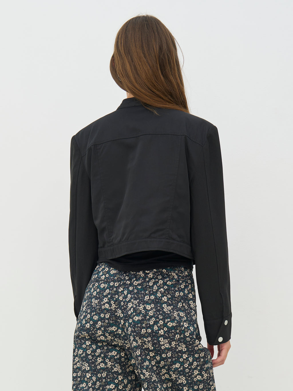 This jacket has a modern, cool expression with its short length and the combination of matte and glossy materials. At the front, it features multiple zippers and snap buttons that add both function and character to the design. The high collar with snap button gives a sharp look, while the long sleeves round off the look in a classic way. At the back, the jacket is kept simple with clean lines. Style it over a top, dress, or light knit for a stylish everyday look with an edge.