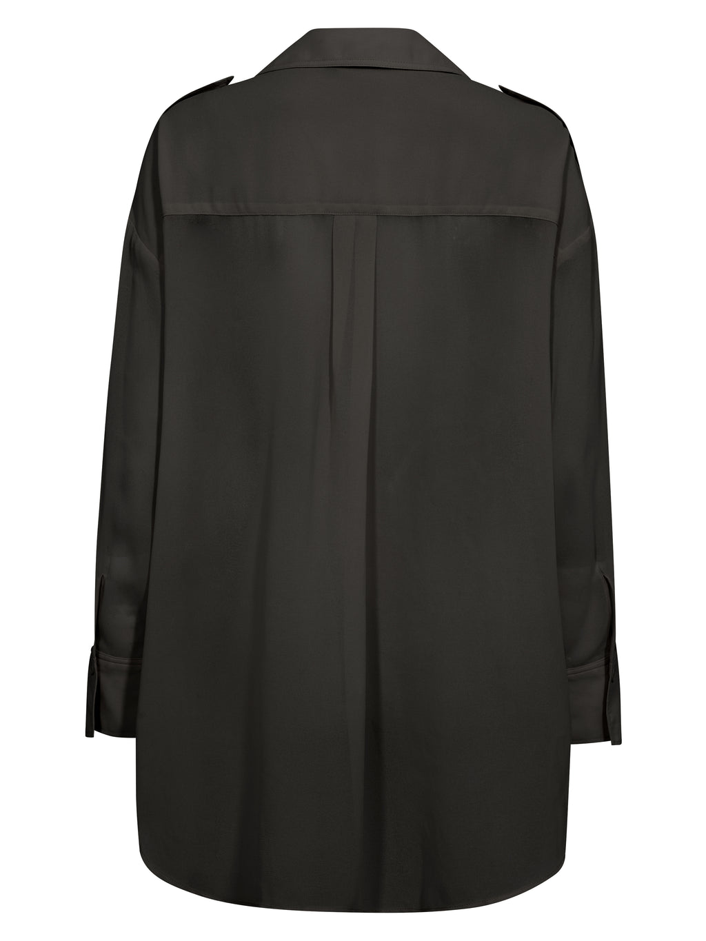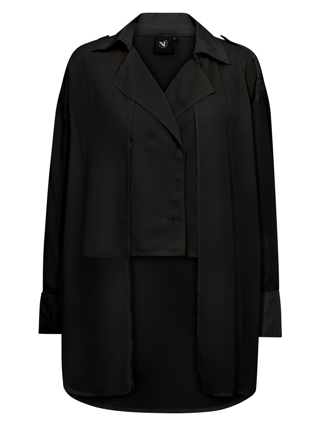 This shirt has a light and simple expression with a loose fit that falls softly on the body. The front is classic with a collar and button closure, while the back is lightly transparent with a discreet yoke and pleats that provide extra movement. The long sleeves end with cuffs and emphasize the relaxed cut. Style the shirt over a top and with pants or jeans for an effortless everyday look, or leave it open as a light layer.