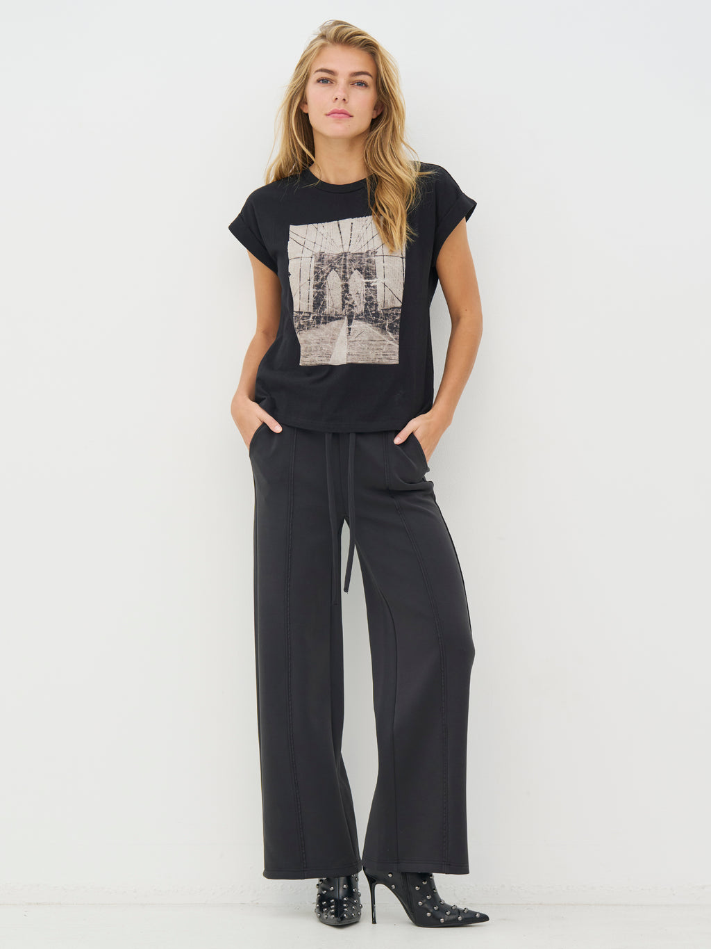 This T-shirt has a relaxed and simple cut with short sleeves and a round neck. On the front, there is a graphic print that gives a raw and modern look, while the back is kept very simple. The fit makes it easy to wear every day and style in different ways. Pair the T-shirt with loose pants, jeans, or under a jacket for a relaxed and effortless look.