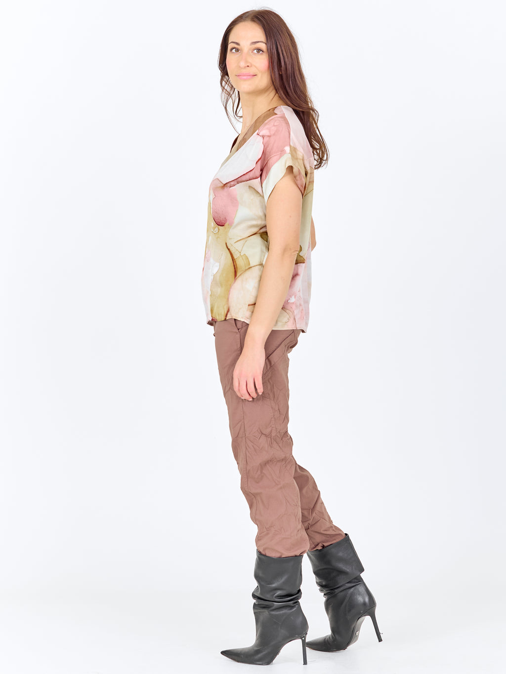 This blouse has a simple cut with a V-neckline and short sleeves, giving a relaxed and versatile look. The print is both on the front and back, adding character and edge. The fit is straight, so the blouse falls nicely on the body and is easy to style with both pants and shorts. Wear it alone for everyday use or with a light jacket for a complete look.