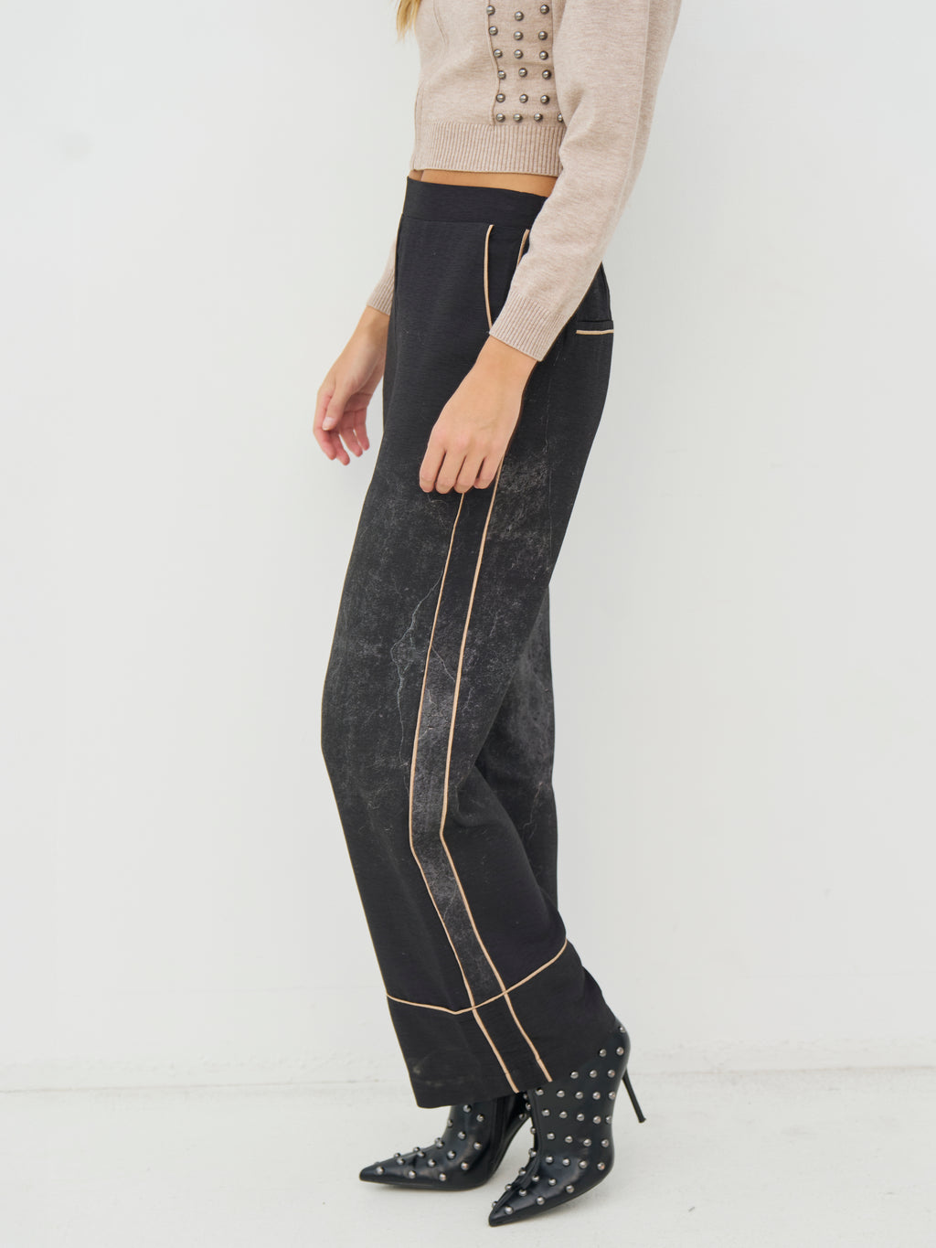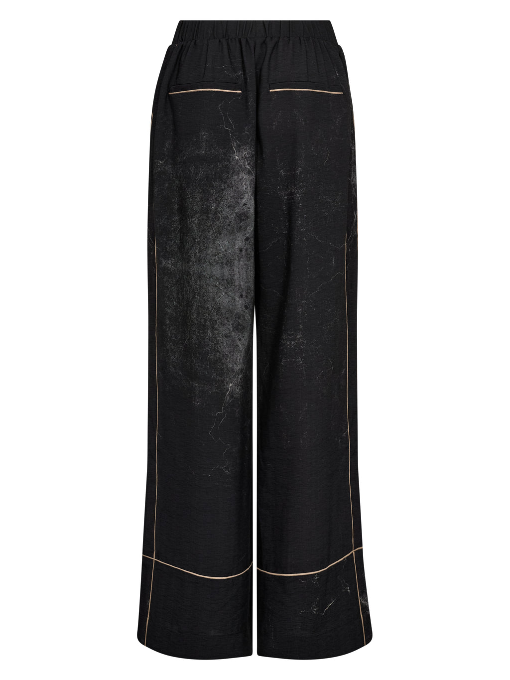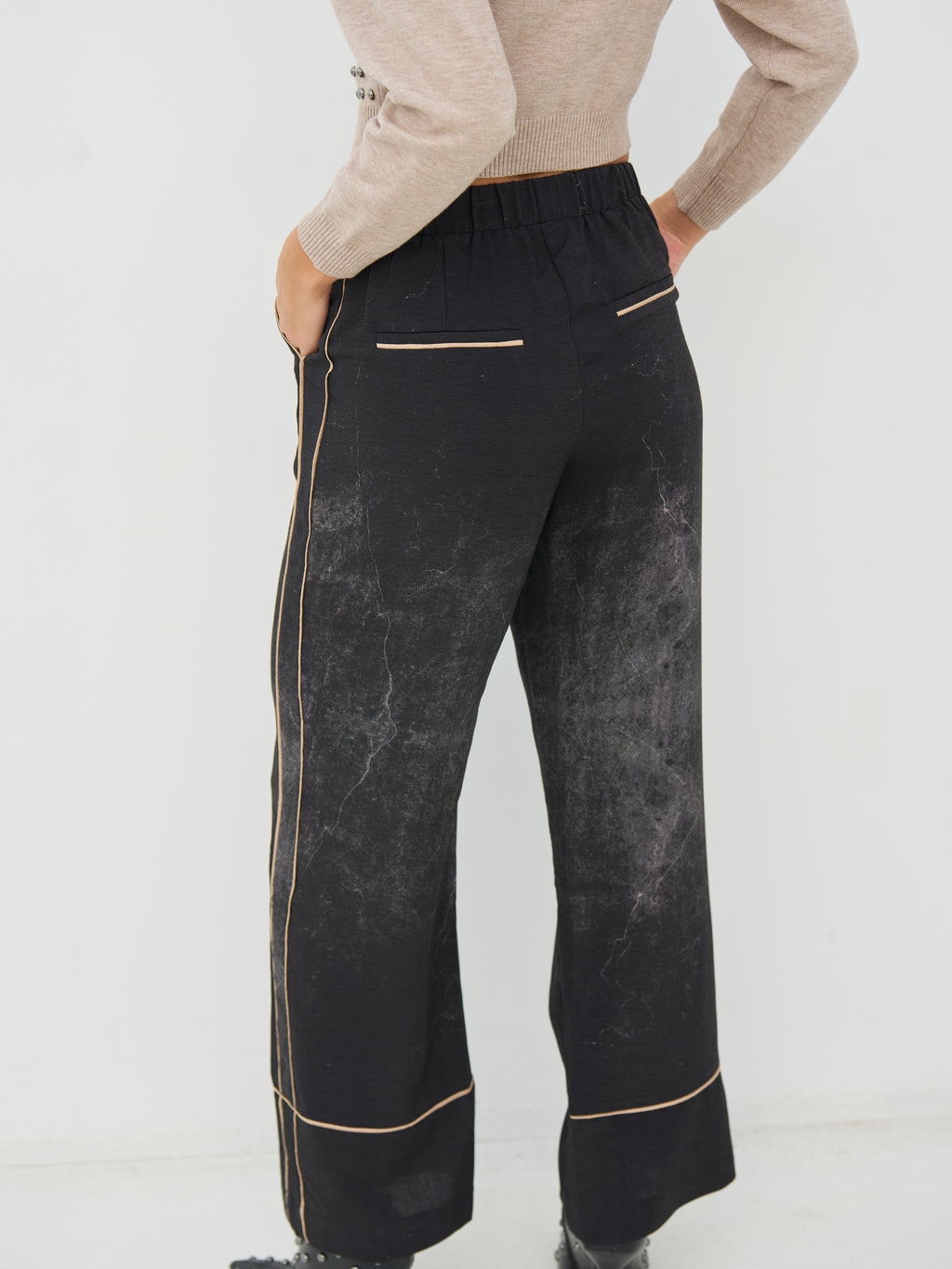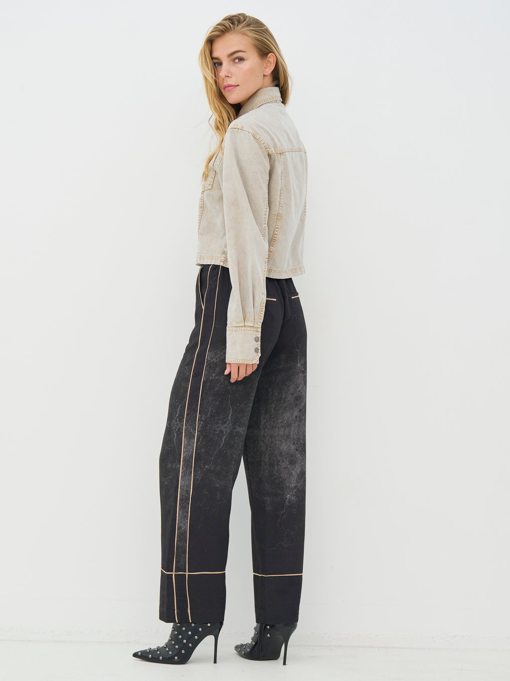These trousers have a relaxed fit with wide legs that fall nicely, giving a distinctive yet still usable look. The waist has elastic, making them comfortable to wear, while the graphic wash gives the trousers a raw and vibrant look. The fine contrast stitching along the legs and at the hem adds extra character, while the back is kept simpler with discreet pockets. The trousers are easy to style and work for both everyday and more relaxed occasions.