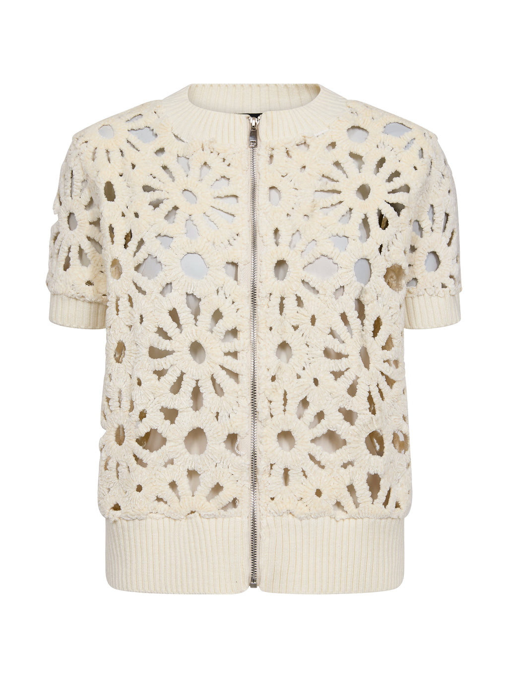 This short jacket/cardigan has a floral eyelet pattern that gives a light and decorative look. It closes with a full zip at the front and has short sleeves and a simple finish at the neck and bottom. The back follows the same pattern and gives a calm overall impression. Style it over a simple top or dress, or wear it with loose pants for a relaxed and versatile everyday look.