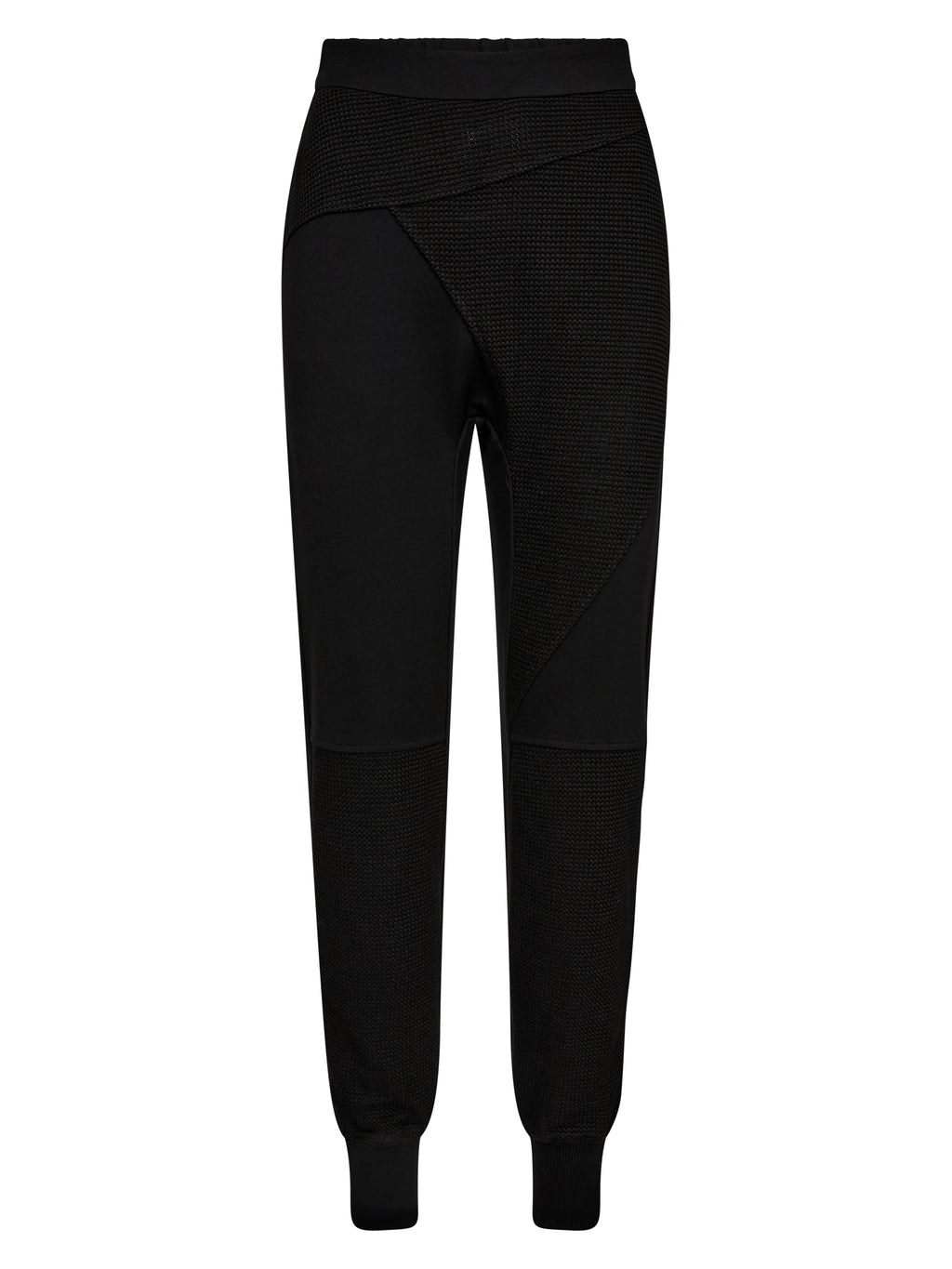 These pants have a relaxed yet striking look with a slim fit that softly gathers at the ankles. The front is divided into contrasting materials and slanted lines, providing a raw and modern feel, while the pockets are conveniently placed at the sides. The back is more straightforward with an elastic waistband to ensure comfort all day long. The pants work well for both everyday wear and more laid-back occasions. Style them with a simple top or sweater for a cool and versatile look.