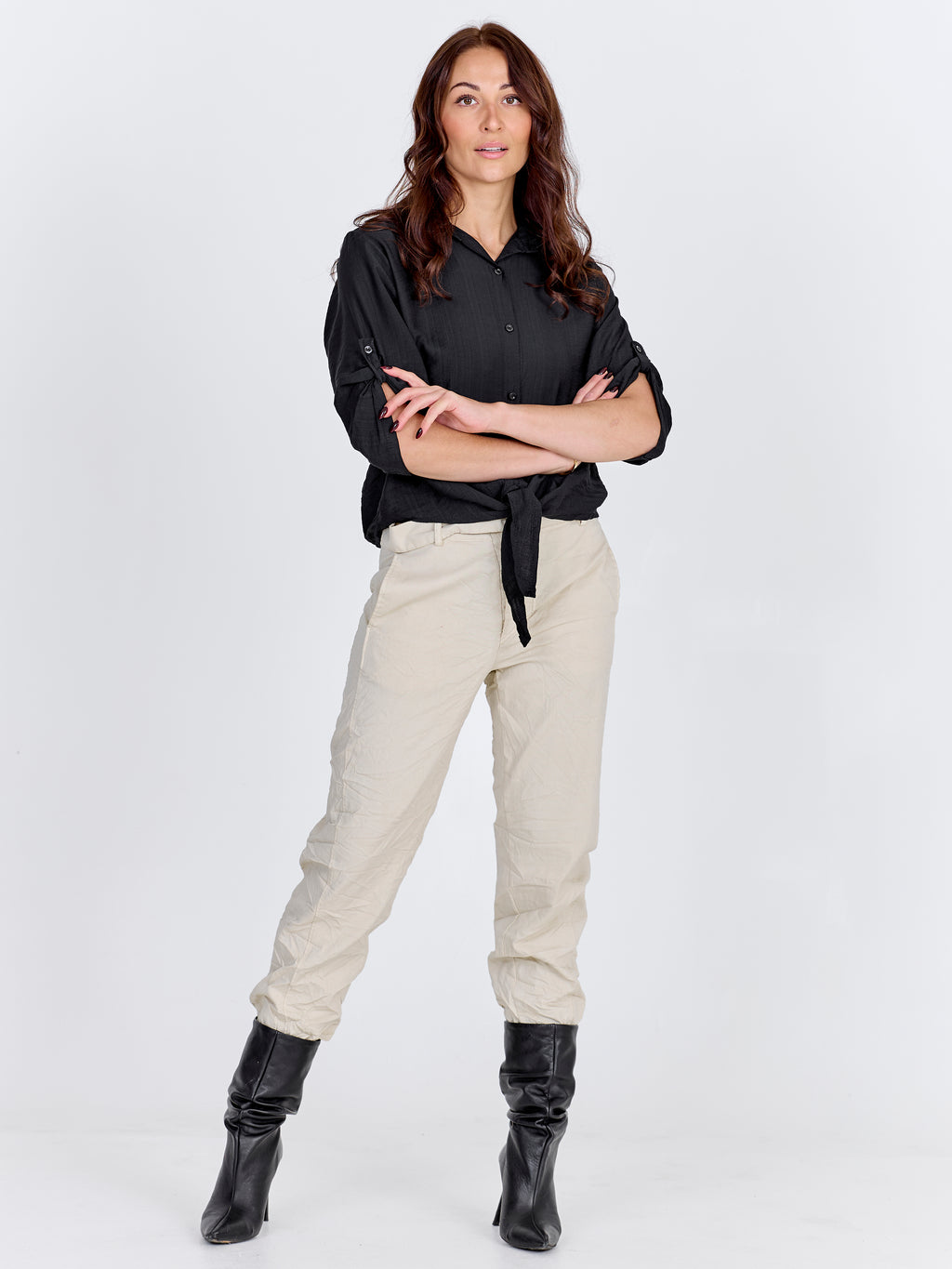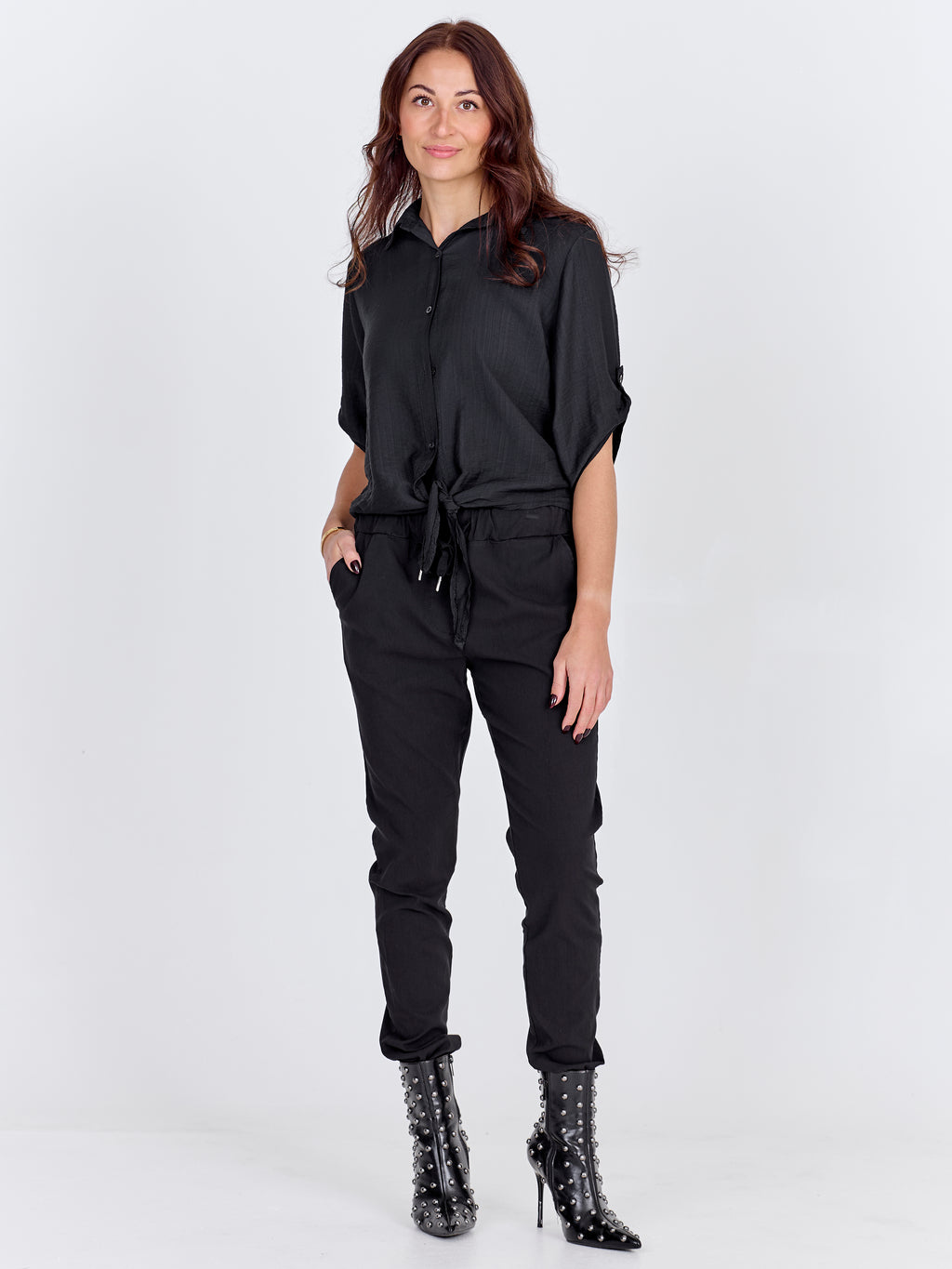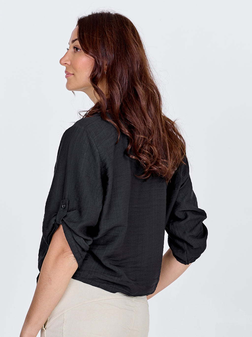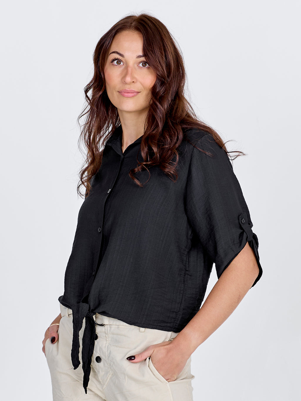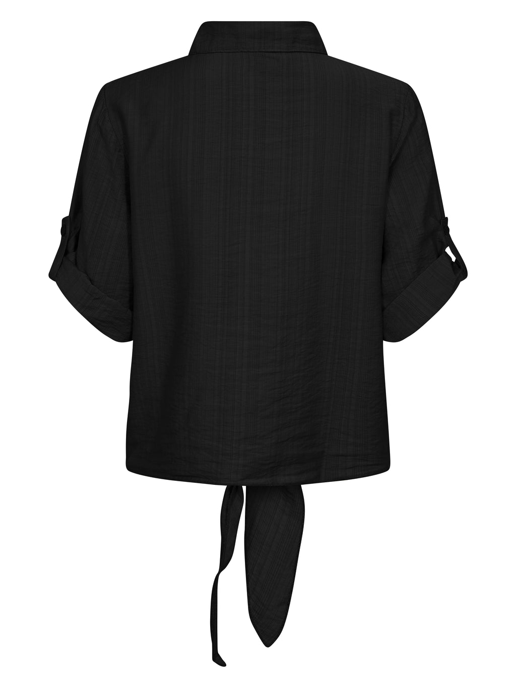This shirt has a light and relaxed look with short sleeves that can be rolled up and fastened with a loop. It closes at the front with buttons and finishes with a decorative tie detail, giving it a feminine touch. The back is simple and straight in cut. Style the shirt with loose trousers, a skirt, or shorts for a casual everyday look, or wear it open over a simple top on warm days.