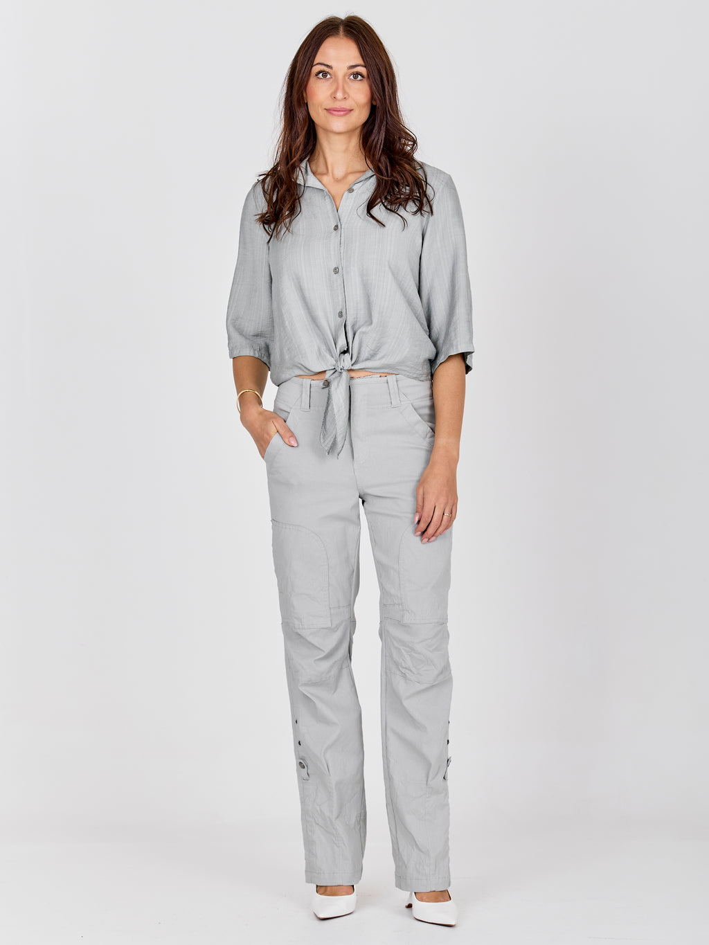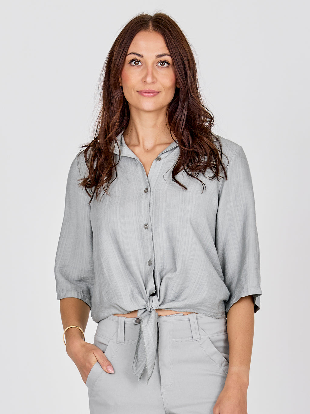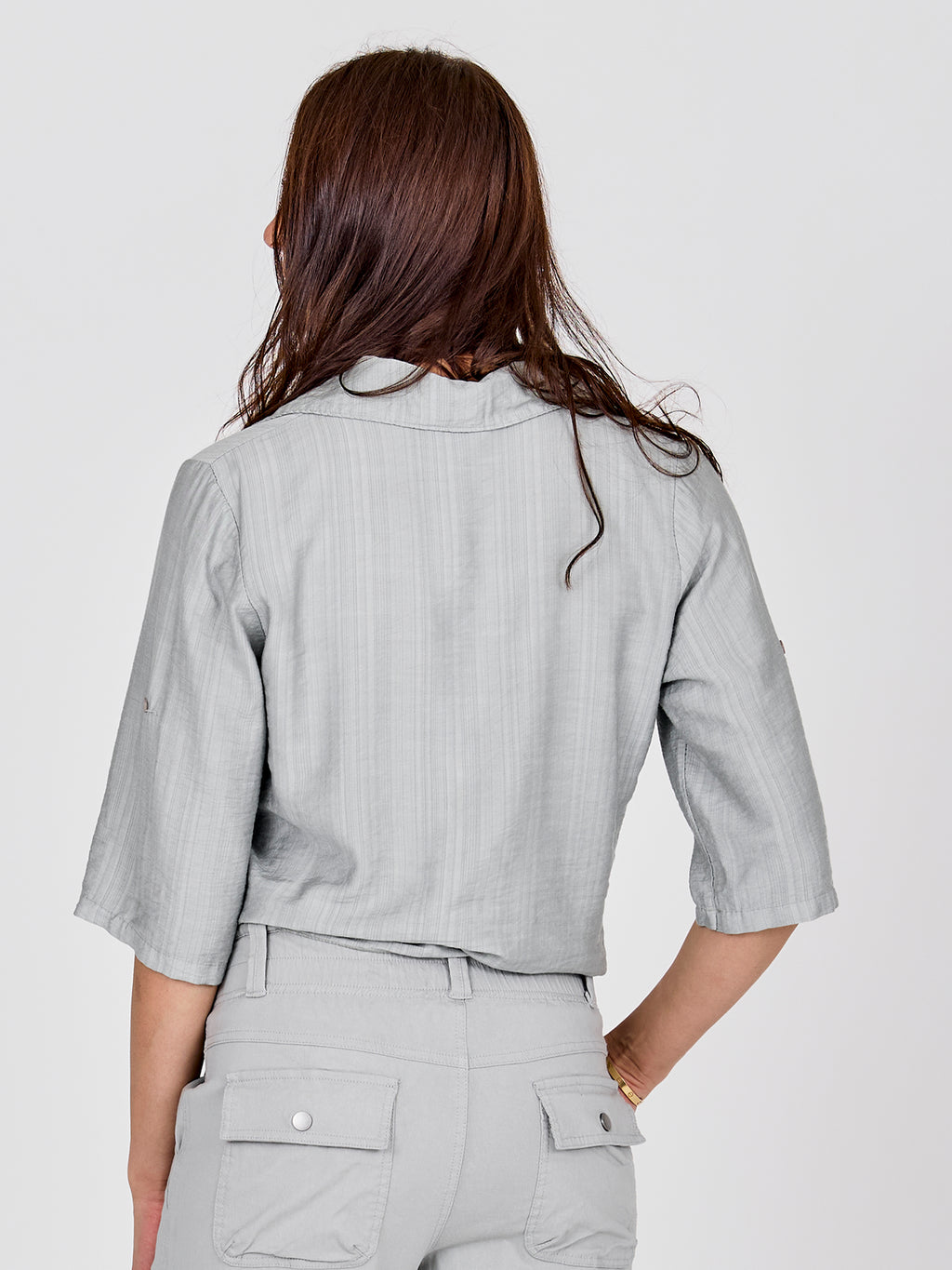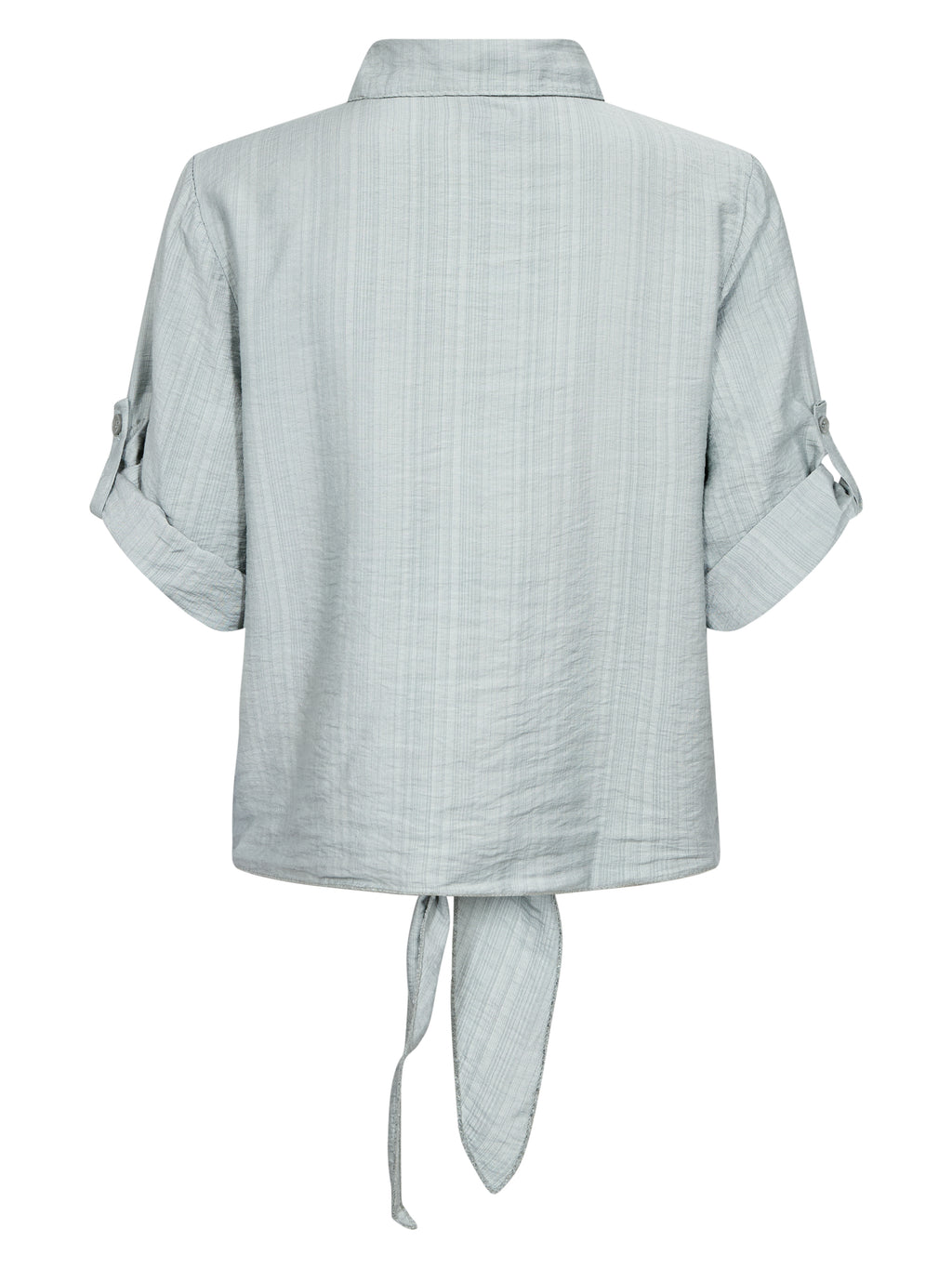 This shirt has a light and relaxed look with short sleeves that can be rolled up and fastened with a loop. It closes at the front with buttons and finishes with a decorative tie detail, giving it a feminine touch. The back is simple and straight in cut. Style the shirt with loose trousers, a skirt, or shorts for a casual everyday look, or wear it open over a simple top on warm days.