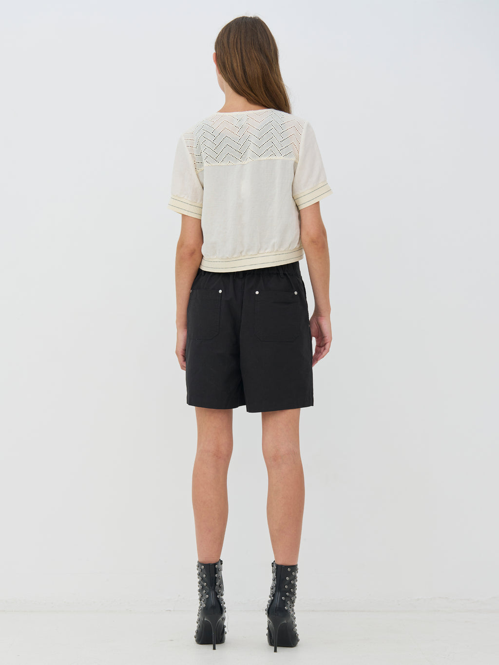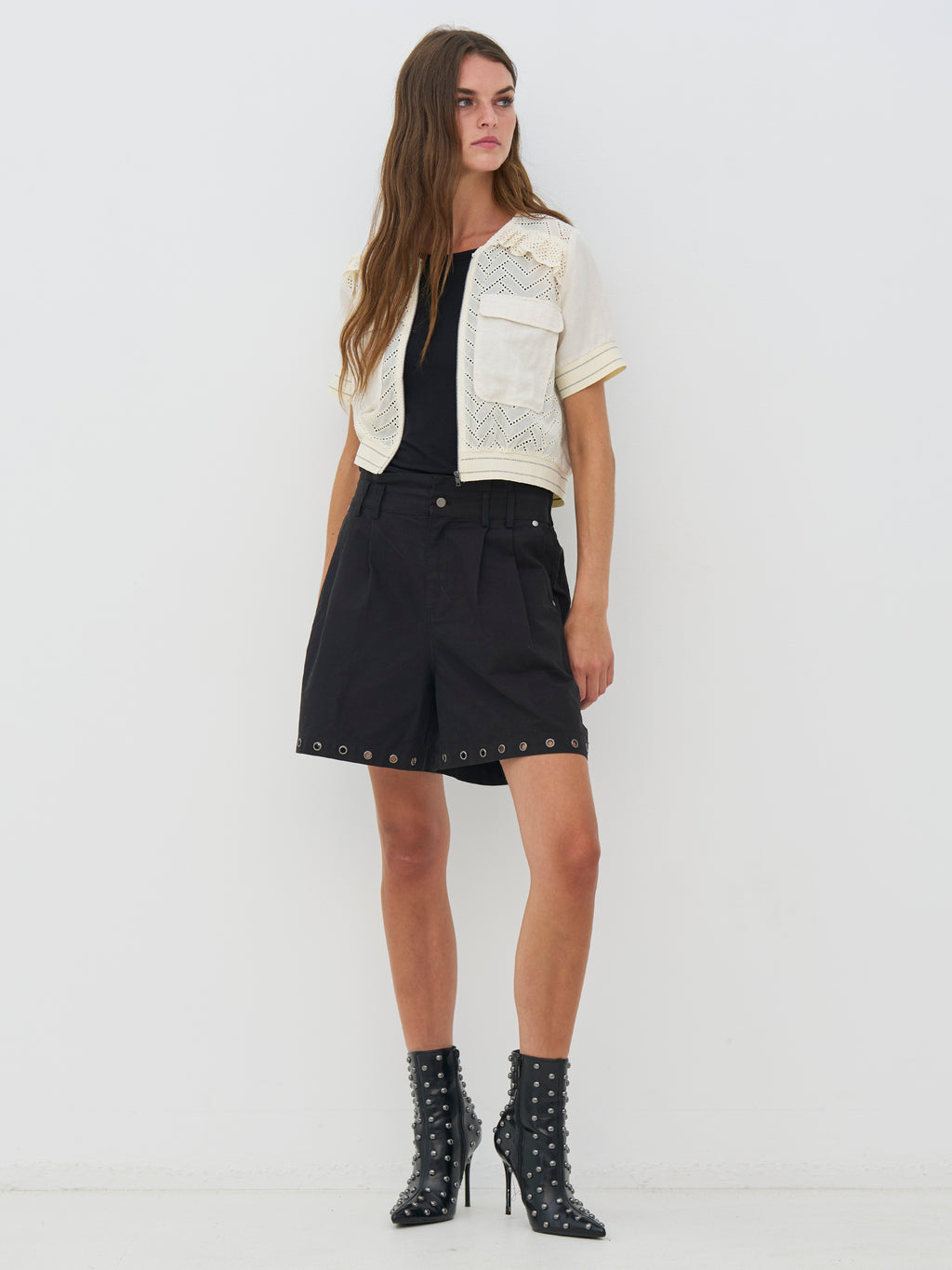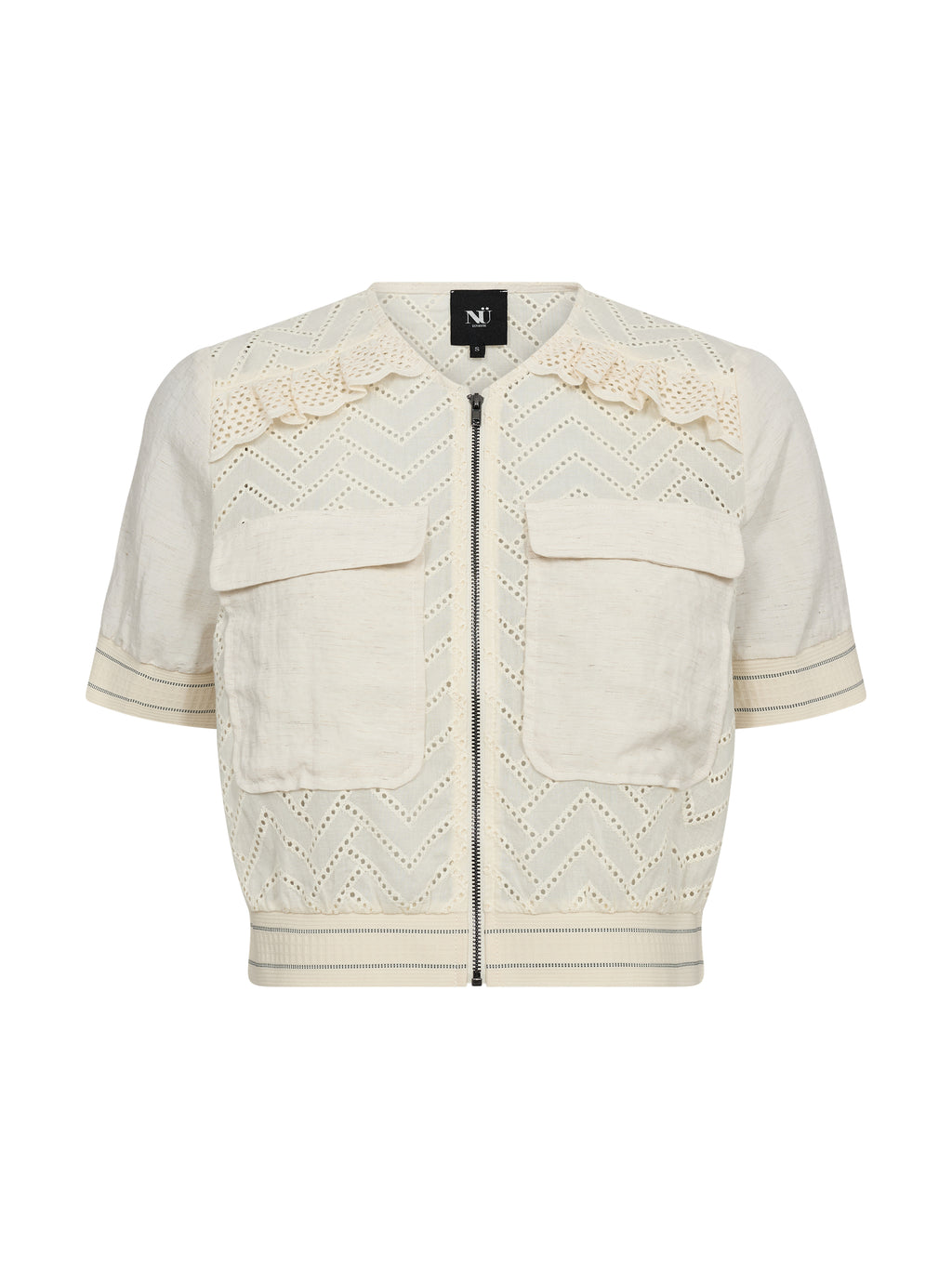 This short jacket has a feminine and light expression with a full-length zipper at the front. At the front, the sewn-on pockets give a relaxed impression, while the fine structure of the fabric adds depth without feeling heavy. The short sleeves and the soft finish at the edge make the jacket comfortable to wear and easy to style. At the back, the design is more simple and falls nicely along the back. Wear the jacket over a top or dress, or style it with pants for an everyday look with a feminine twist.
