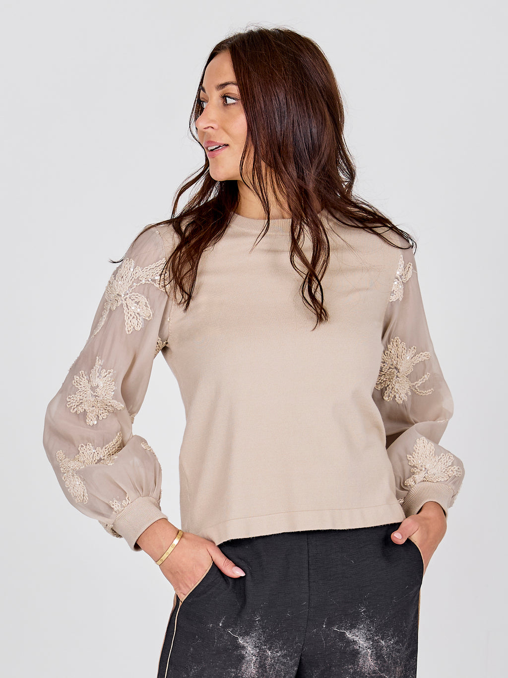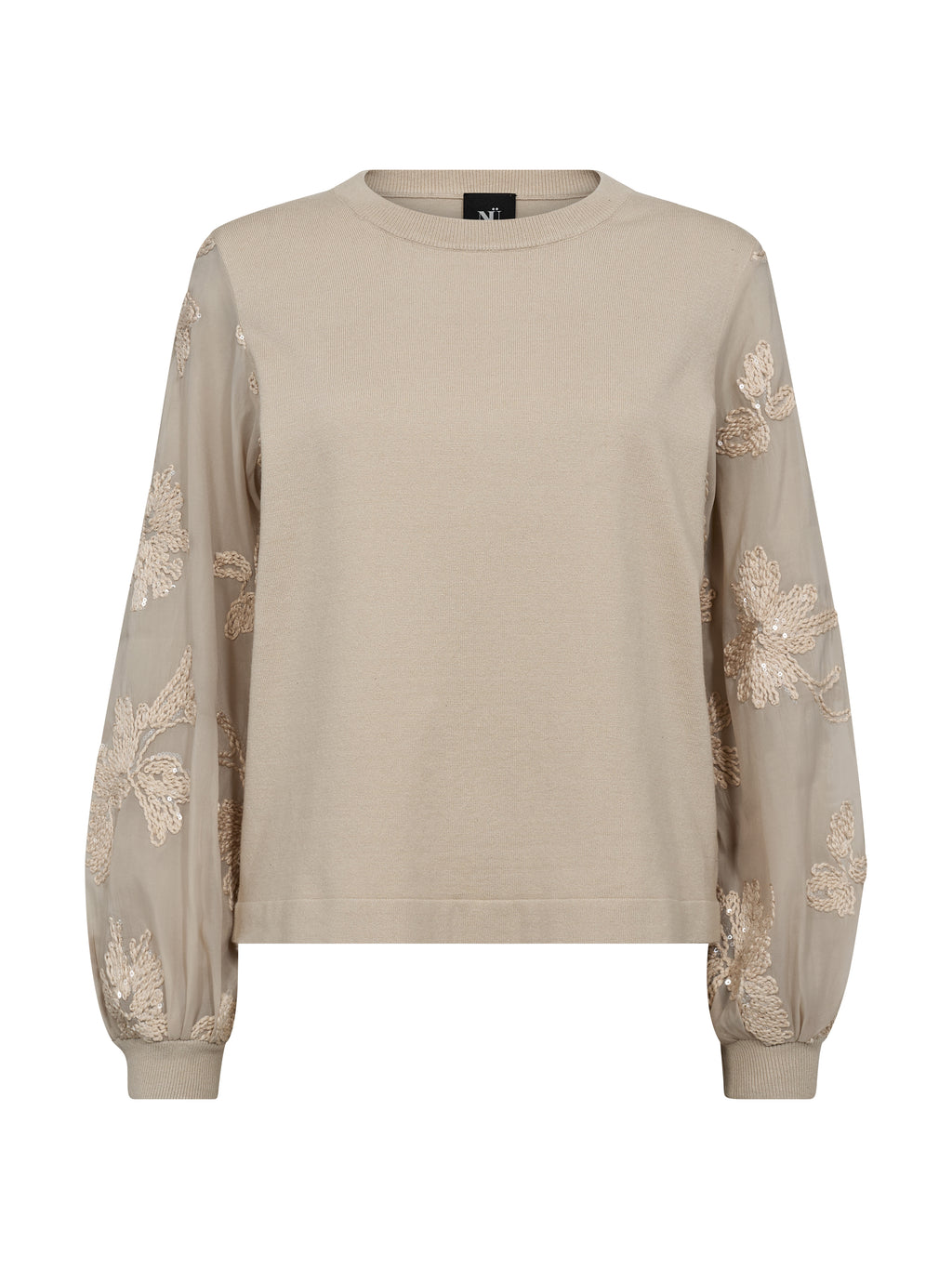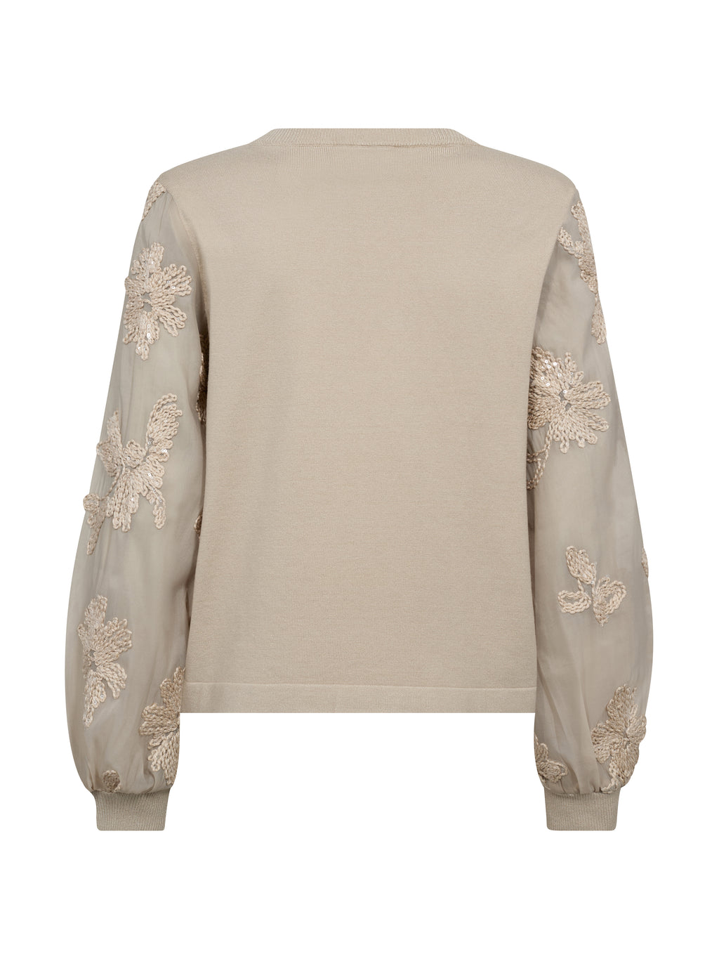 The blouse has a simple front with a knitted top that gives a calm and relaxed look. The sleeves are made of a light, transparent material with embroidered flowers, giving the blouse a feminine touch. The back is kept simple, highlighting the sleeves. Style the blouse with a pair of simple pants or a skirt for a nice everyday look that can also be worn for more formal occasions.