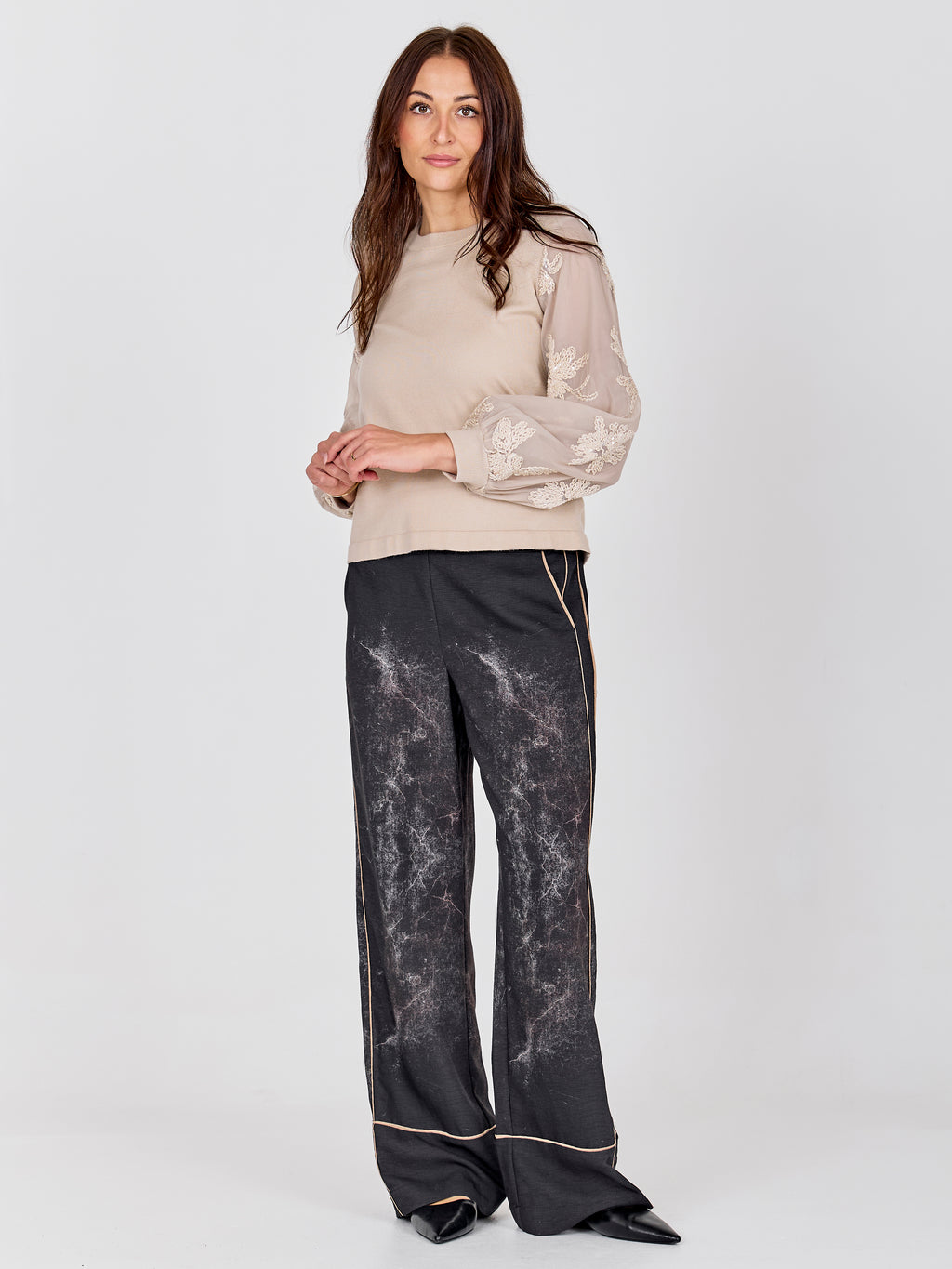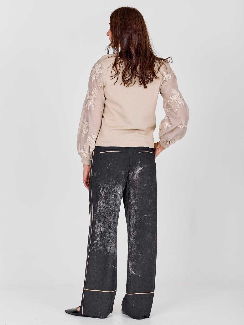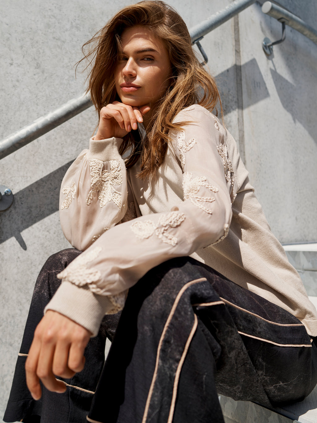 The blouse has a simple front with a knitted top that gives a calm and relaxed look. The sleeves are made of a light, transparent material with embroidered flowers, giving the blouse a feminine touch. The back is kept simple, highlighting the sleeves. Style the blouse with a pair of simple pants or a skirt for a nice everyday look that can also be worn for more formal occasions.
