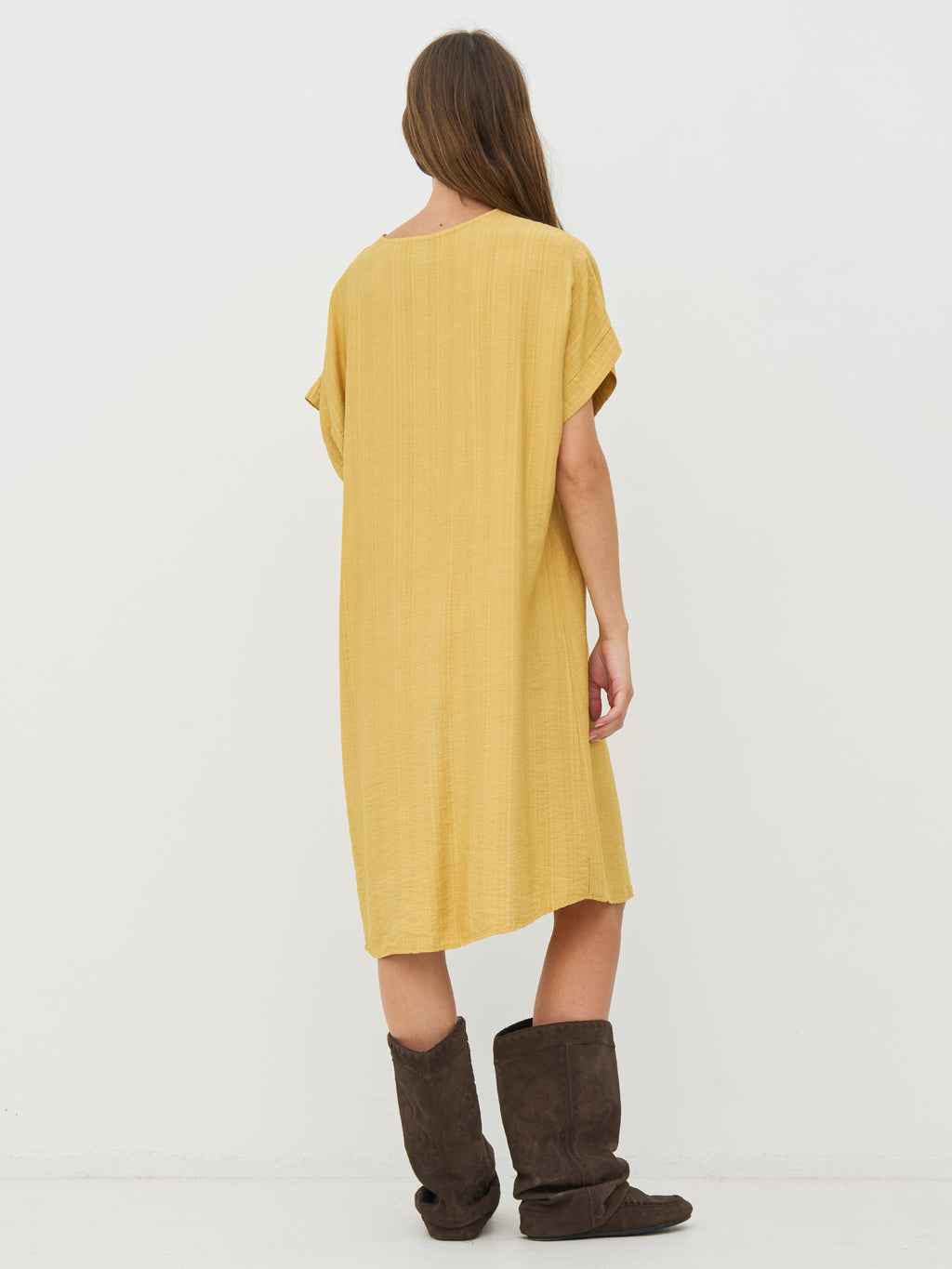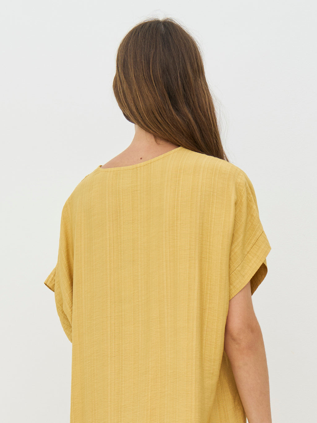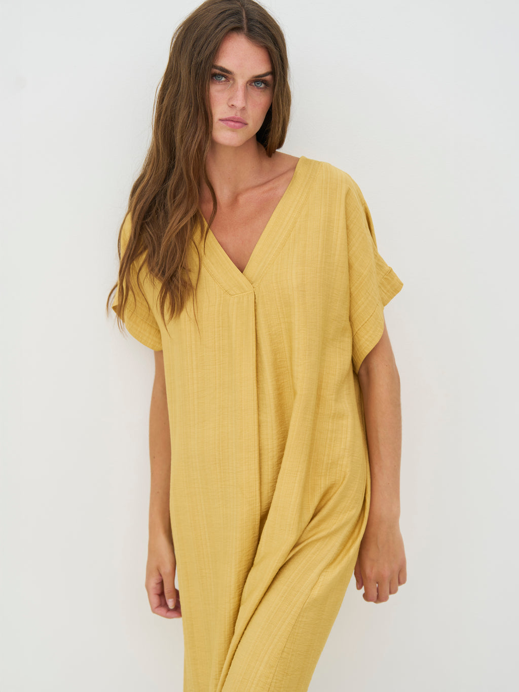 This tunic has a relaxed and simple look with a straight fit that softly drapes along the body. The elegant V-neck creates an open and airy appearance, while the short sleeves keep the silhouette simple and versatile. The length makes it comfortable to wear all day and easy to style, either on its own as a dress or with flat shoes and accessories for a more relaxed look.